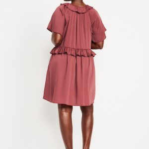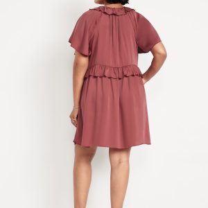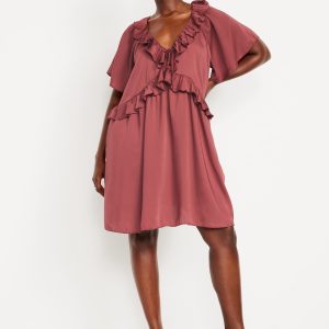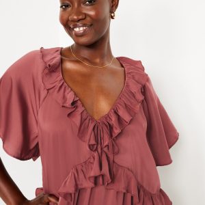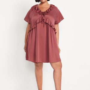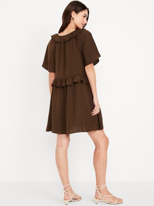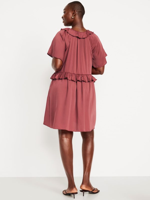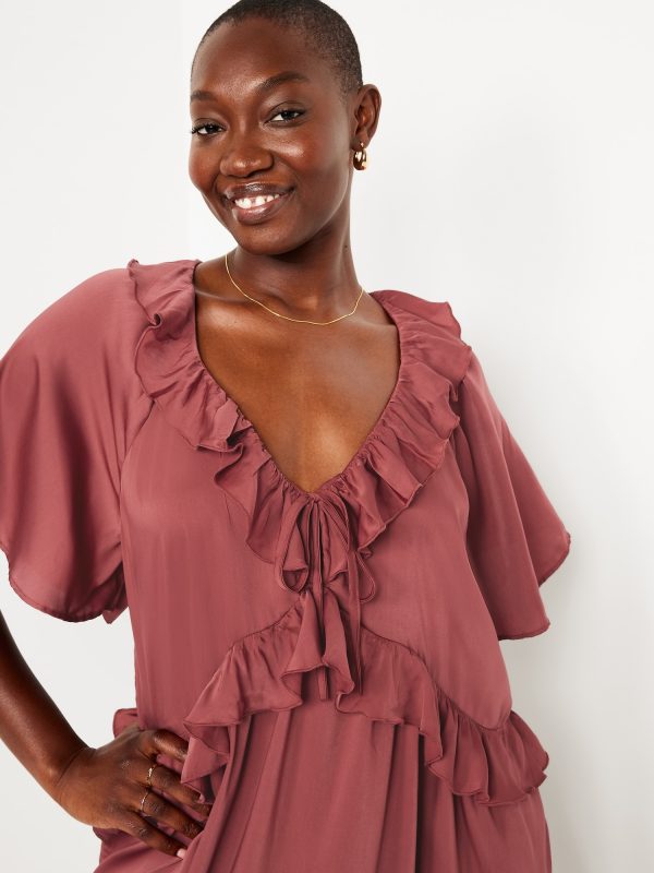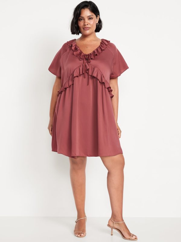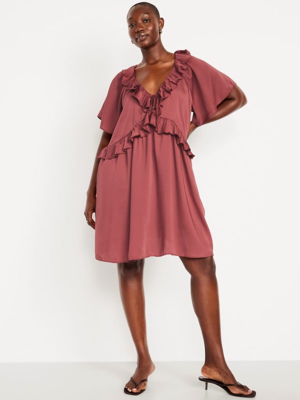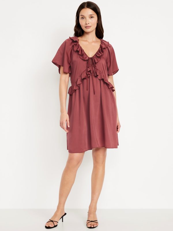 Satin Ruffle Mini Dress: deep v-neck, ruffle overlay at front, short flutter sleeves, ruffle-trim back waist, #809406
