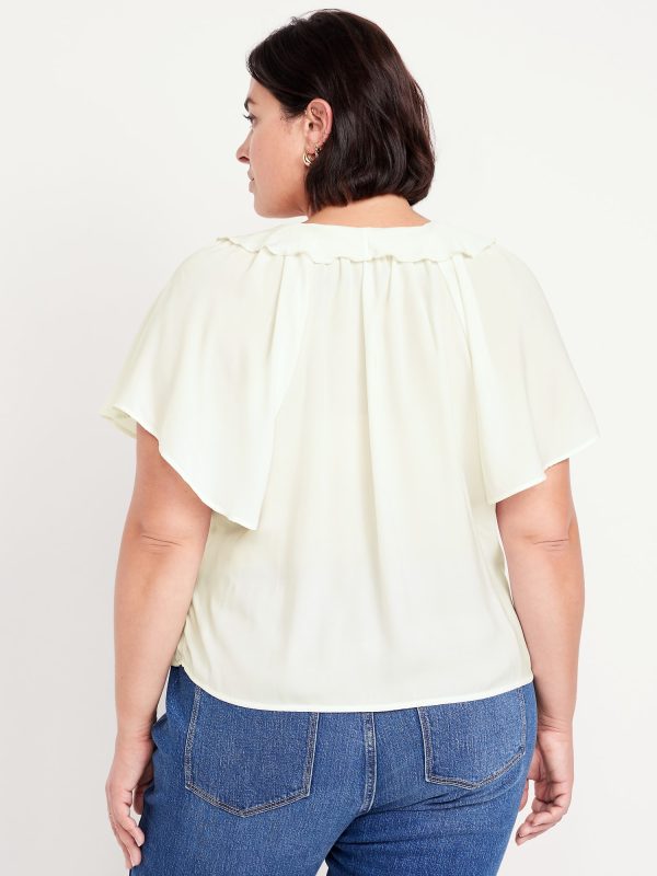 Satin Ruffle Tie-Front Top: tie-front v-neck, ruffle overlay at front, short flutter sleeves, #805737