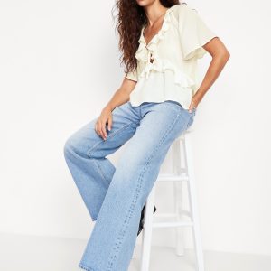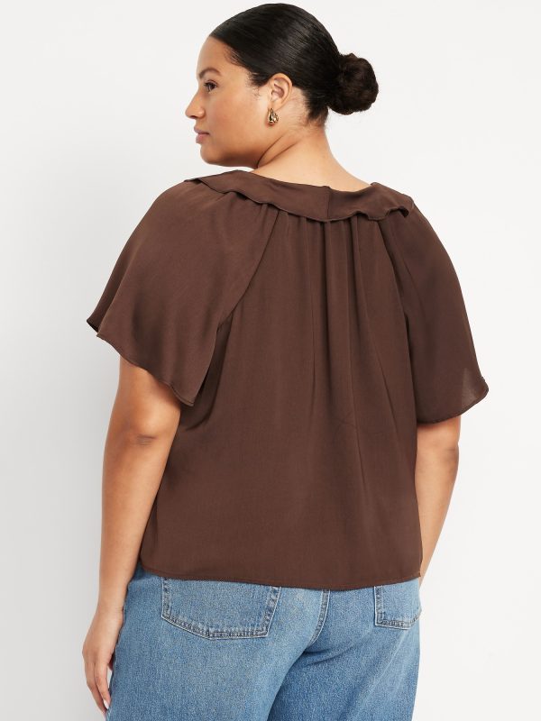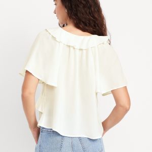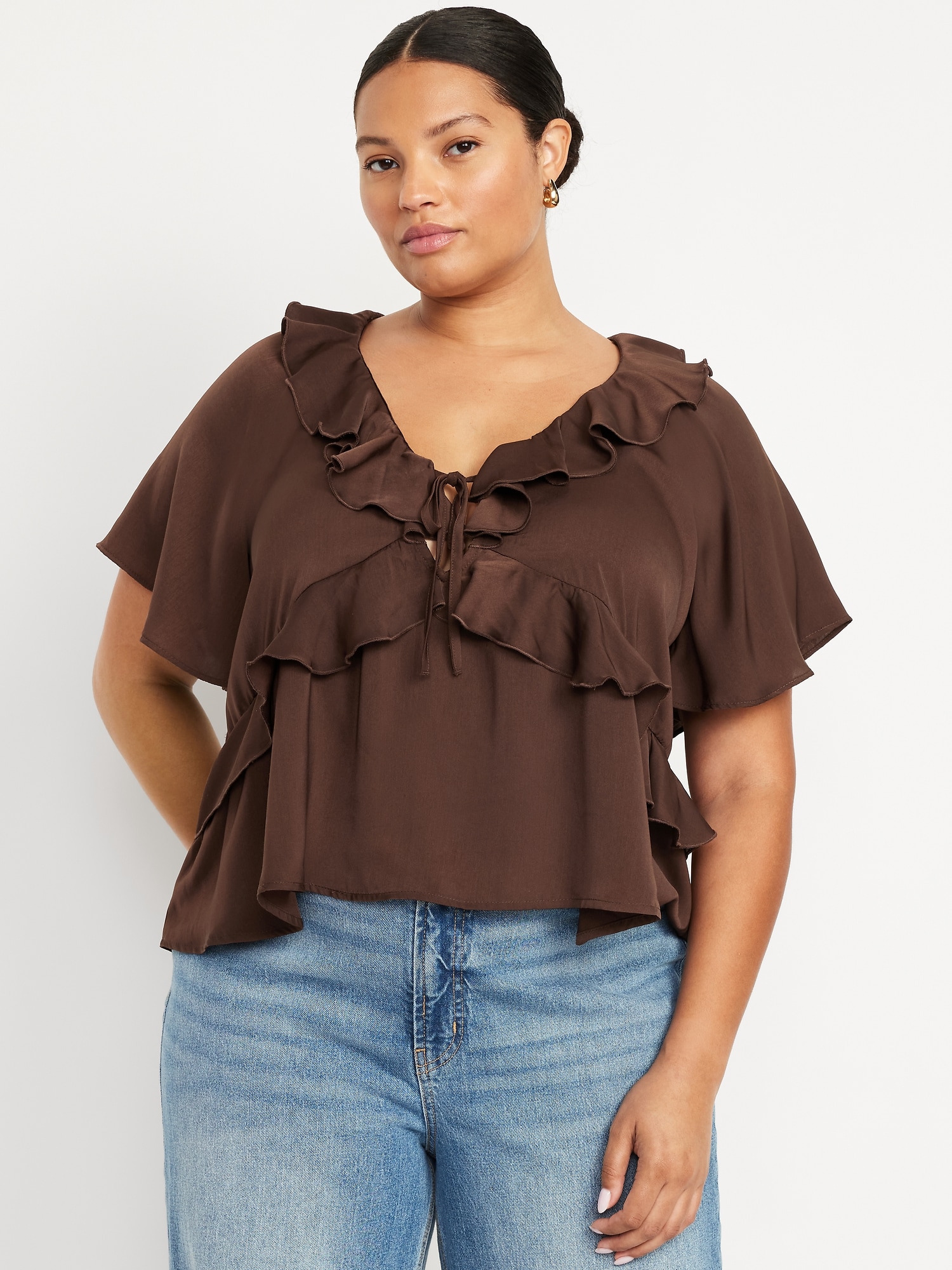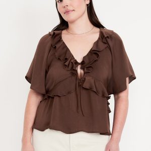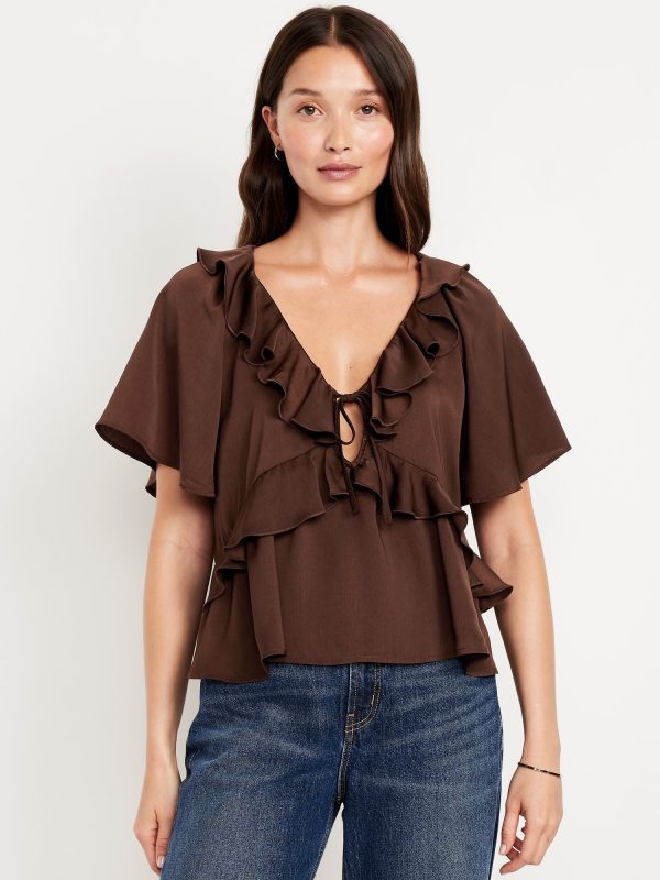 Satin Ruffle Tie-Front Top: tie-front v-neck, ruffle overlay at front, short flutter sleeves, #805737