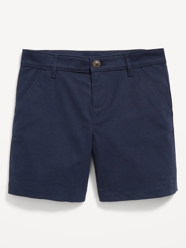 School Uniform Twill Bermuda Shorts for Girls: interior adjustable waistband, snap-button closure in sizes 5-8, regular button closure in sizes 10-20, zip fly, diagonal on-seam hip pockets, welt faux pockets at back, #767123