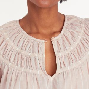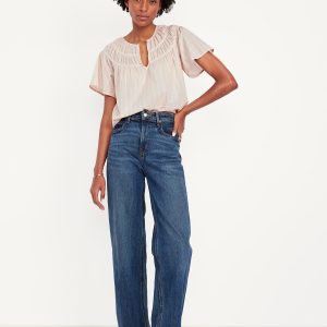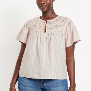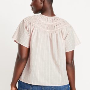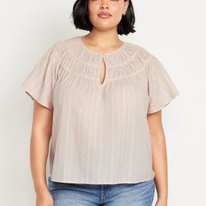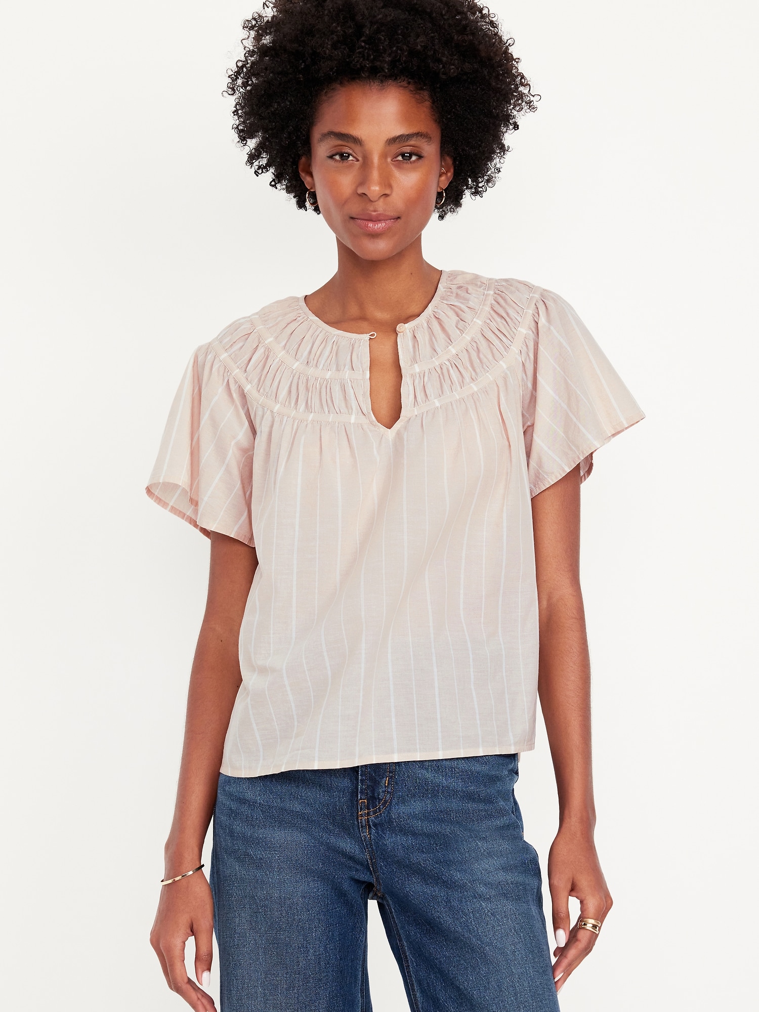Shirred Flutter-Sleeve Top: shirred neckline, front button-loop keyhole closure, short flutter sleeves, floral print, #704186