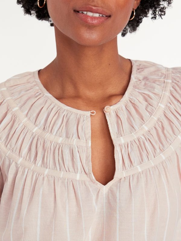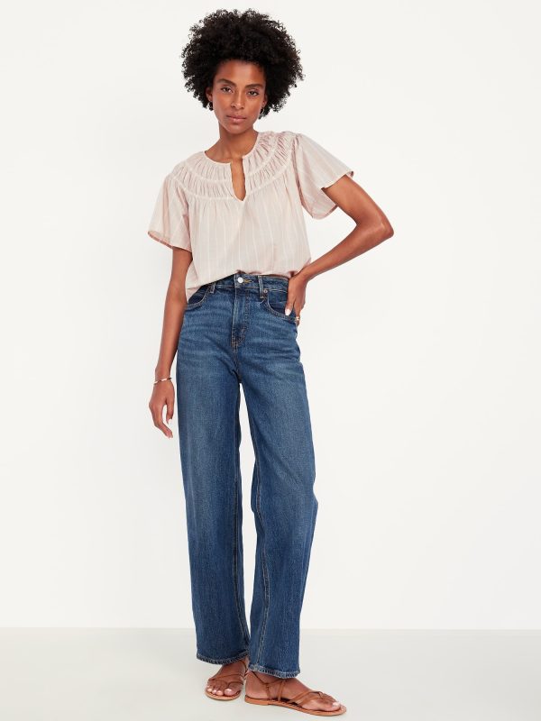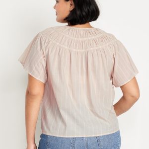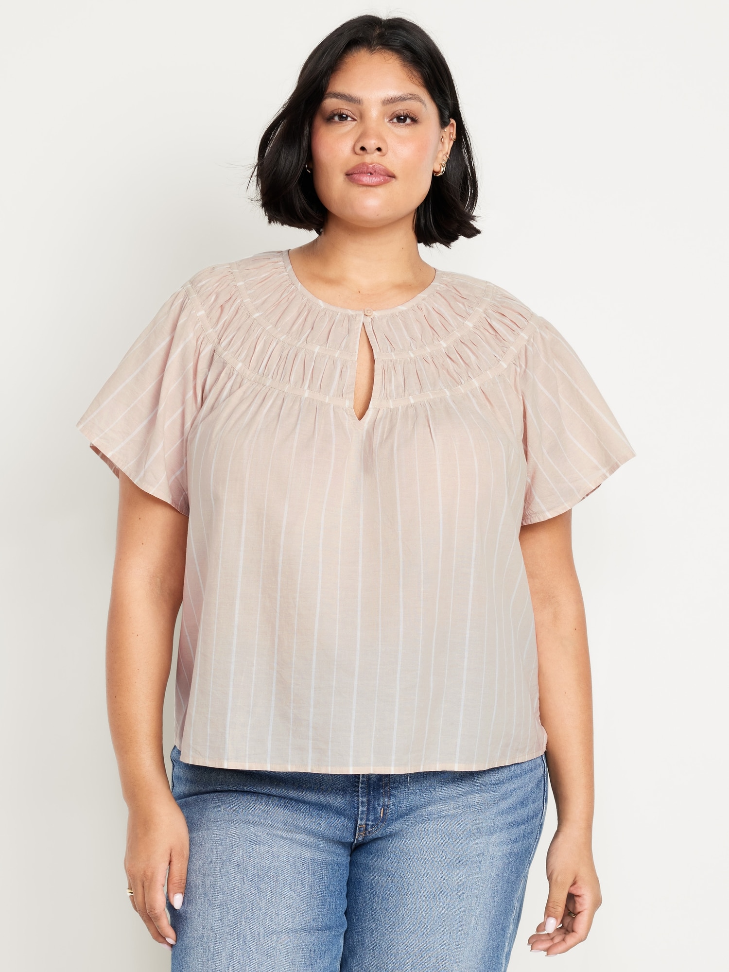 Shirred Flutter-Sleeve Top: shirred neckline, front button-loop keyhole closure, short flutter sleeves, floral print, #704186