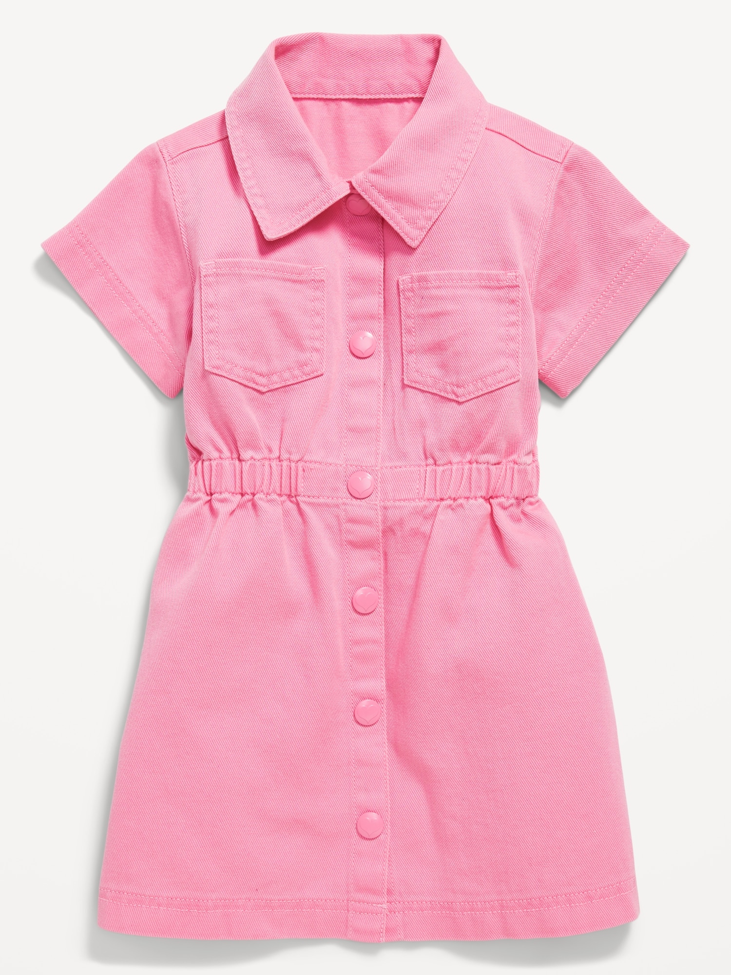 Short-Sleeve Cinched-Waist Twill Dress for Toddler Girls: pointed collar, short sleeves, patch pockets at chest, cinched waist, full length snap-button placket, #767022