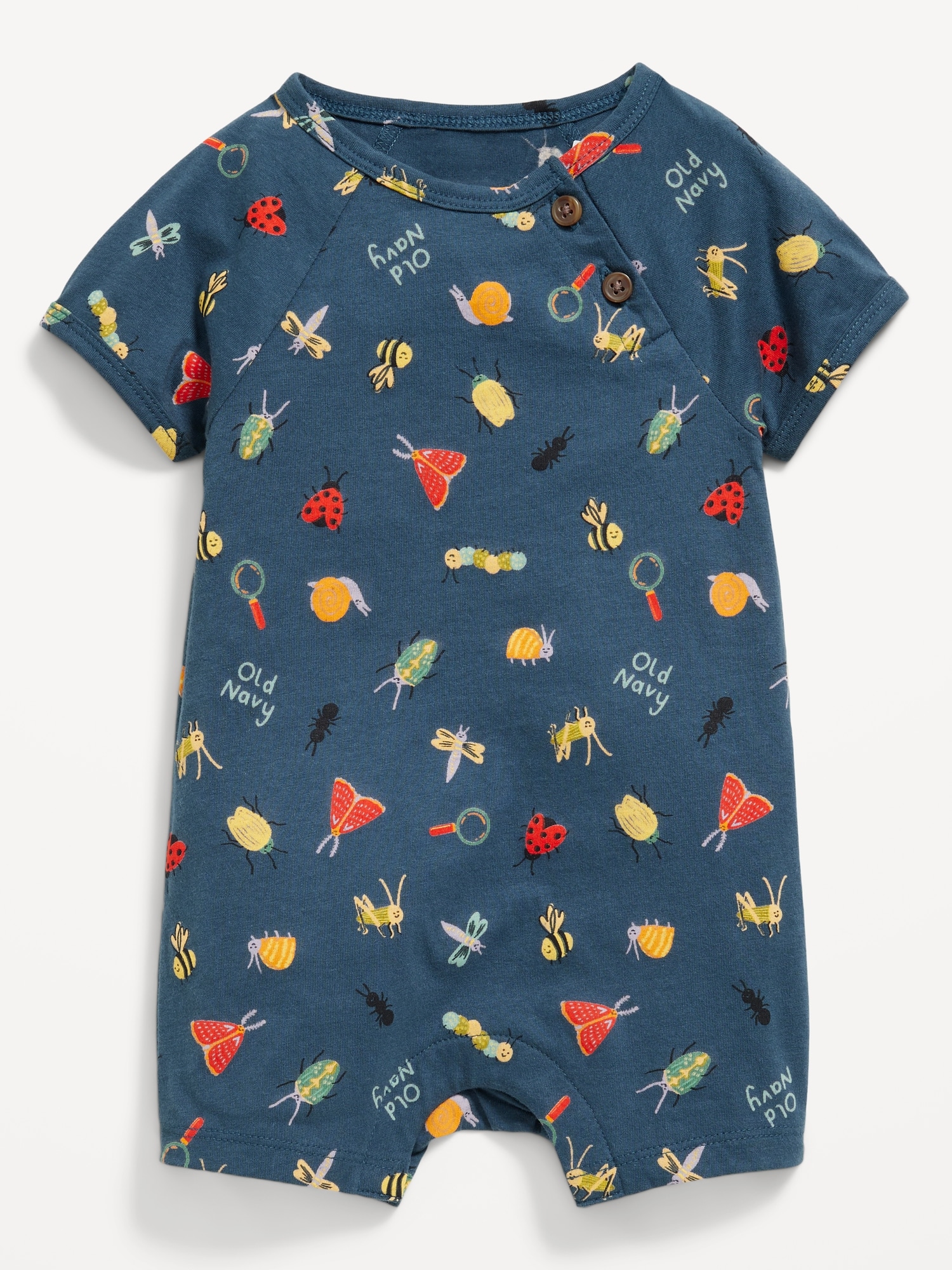 Short-Sleeve Logo-Graphic One-Piece for Baby: rounded neckline, keyhole cutout at nape, ruffle trim along arm openings, logo graphic, hidden snaps along inseam, all-over print, available exclusively online and at old navy outlet stores., #694153