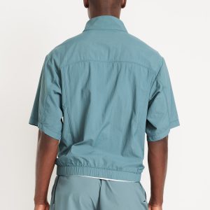 Short-Sleeve Nylon Half-Zip Top: mock neck, short sleeves, half-zip front, vertical zip pockets, cinched-elastic hem, contrasting piping at chest, sleeve and side panels, #749727