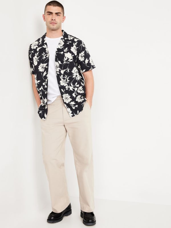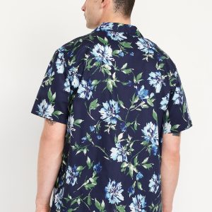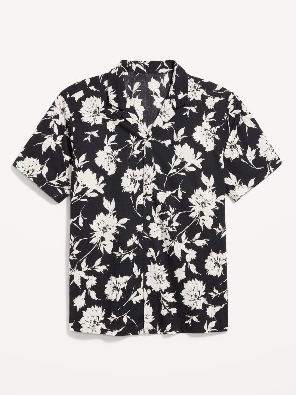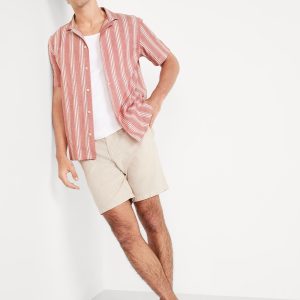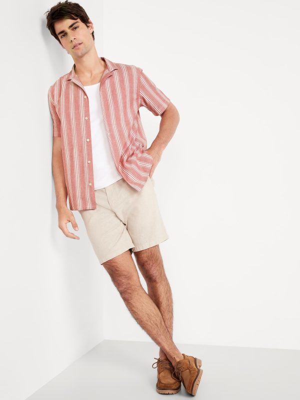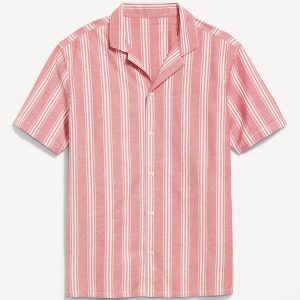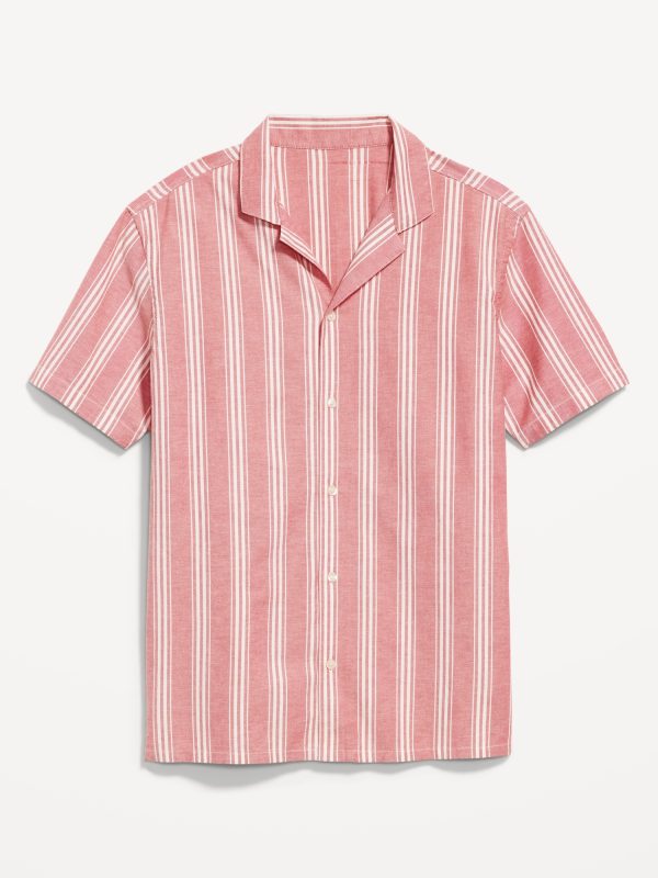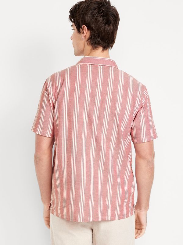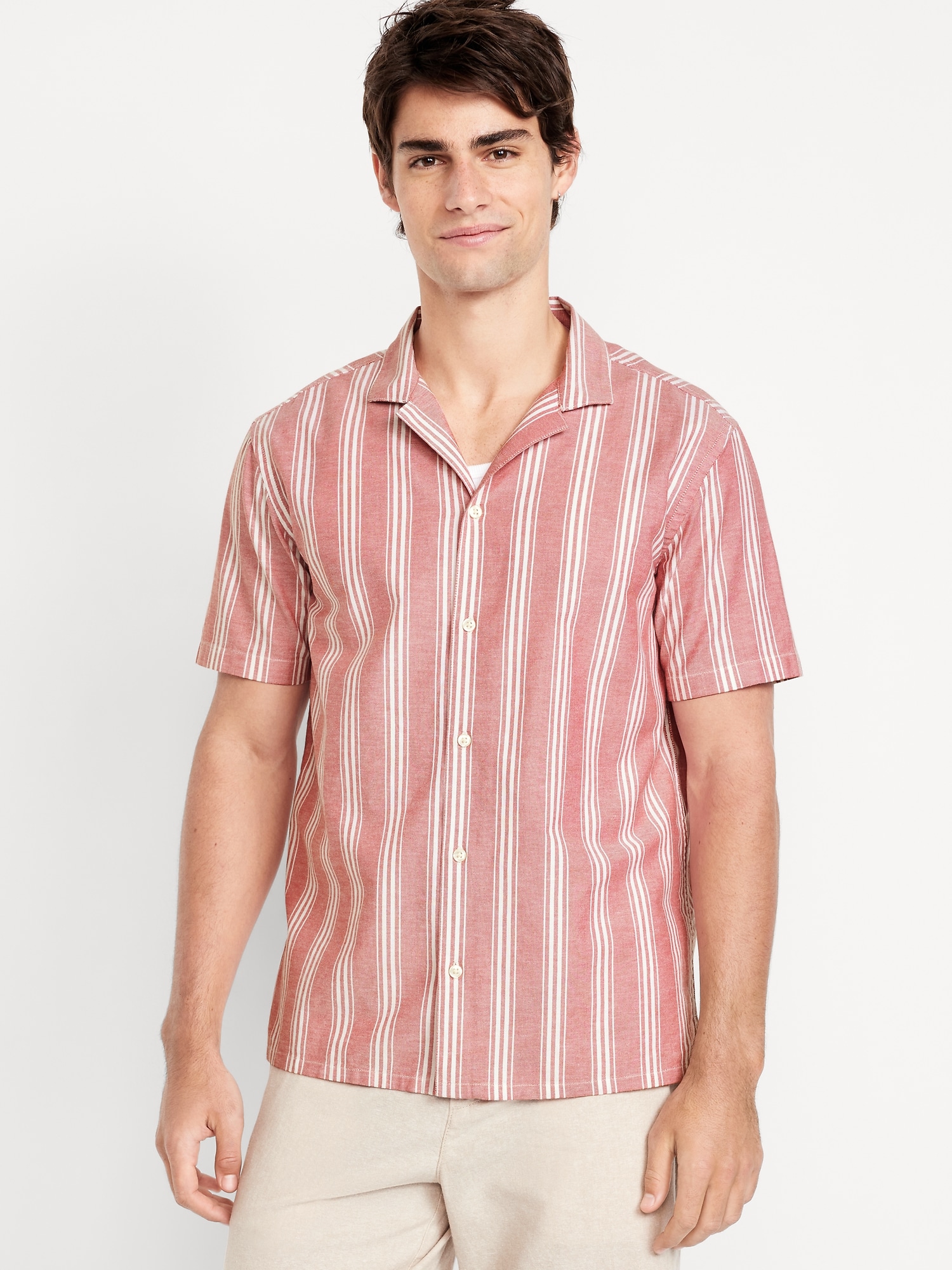 Short-Sleeve Striped Oxford Camp Shirt: notched collar, short sleeves, full-button front, vertical striped print, #762762