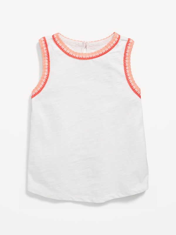 Sleeveless Crochet-Trim Top for Girls: round neckline, sleeveless, button closure and keyhole cutout at nape, crochet knit trim along neckline and sleeve cuffs, rounded hem, #767961