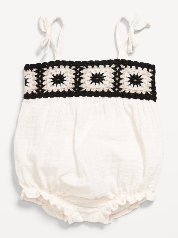 Sleeveless Double-Weave One-Piece Romper for Baby: straight neckline, tie bows at shoulder straps, crochet panel across chest, buttoned placket at back, elasticized bubble leg cuffs, hidden snaps along inseam, #761814