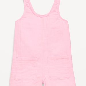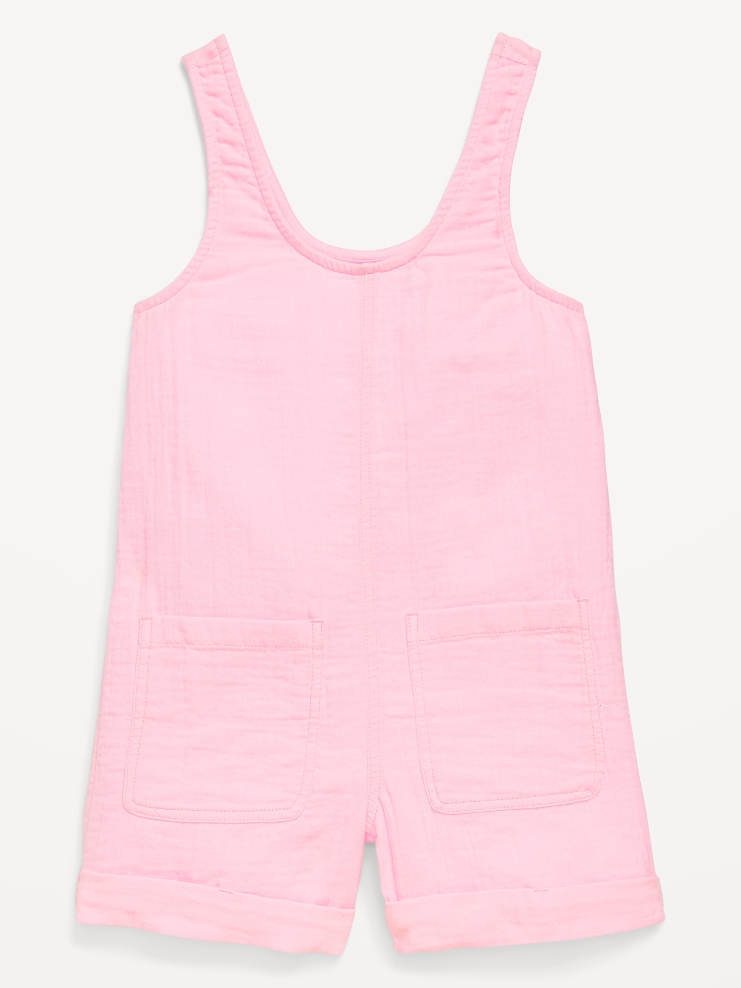 Sleeveless Double-Weave Pocket Romper for Girls: deep scoop neck, sleeveless, patch pockets at front, rolled leg cuffs, #766632