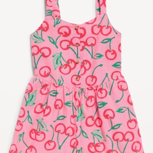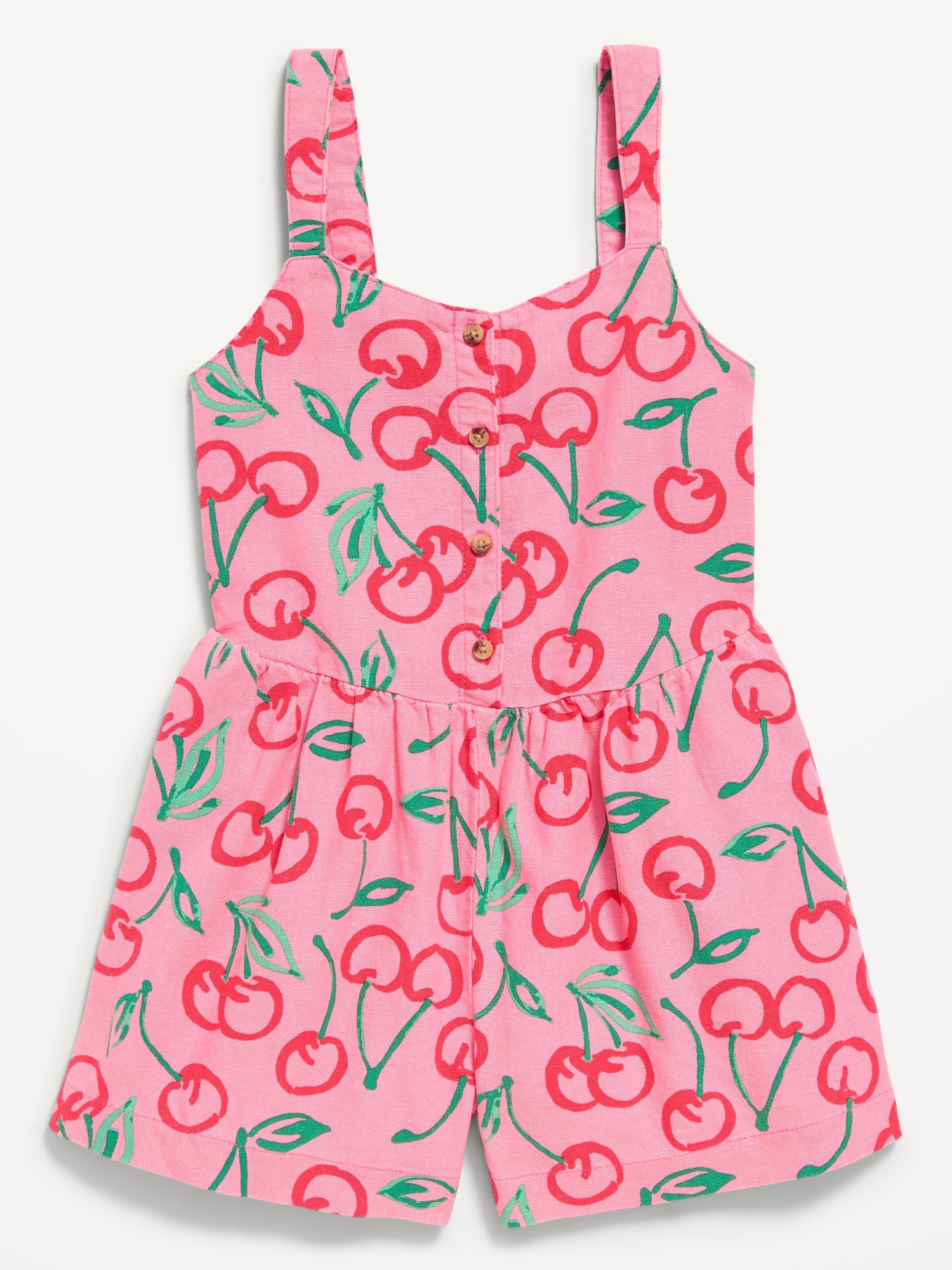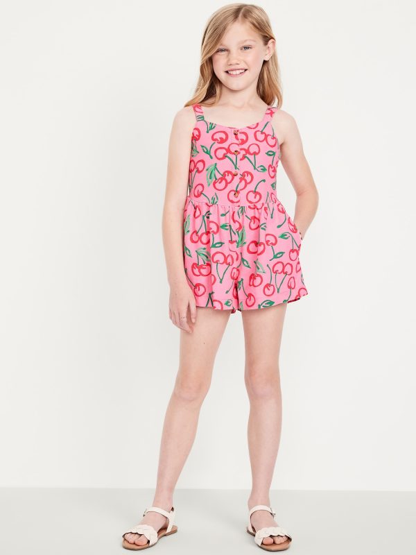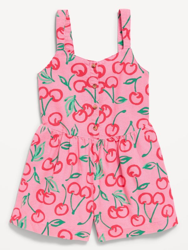 Sleeveless Linen-Blend Button-Front Romper for Girls: heart neckline, wide shoulder straps, button-front, seamed waist, smocked back, on-seam pockets, all-over pattern, #691100
