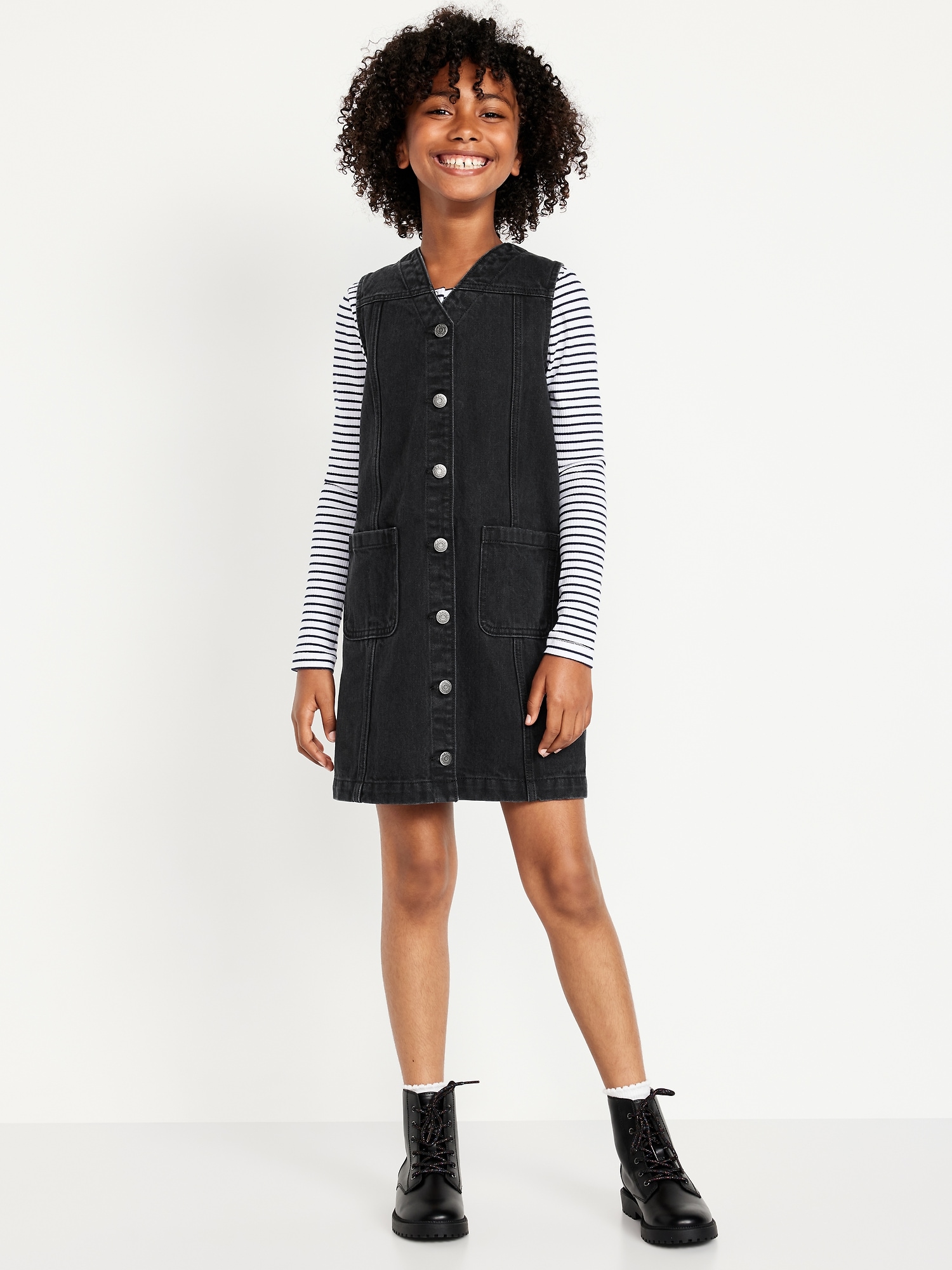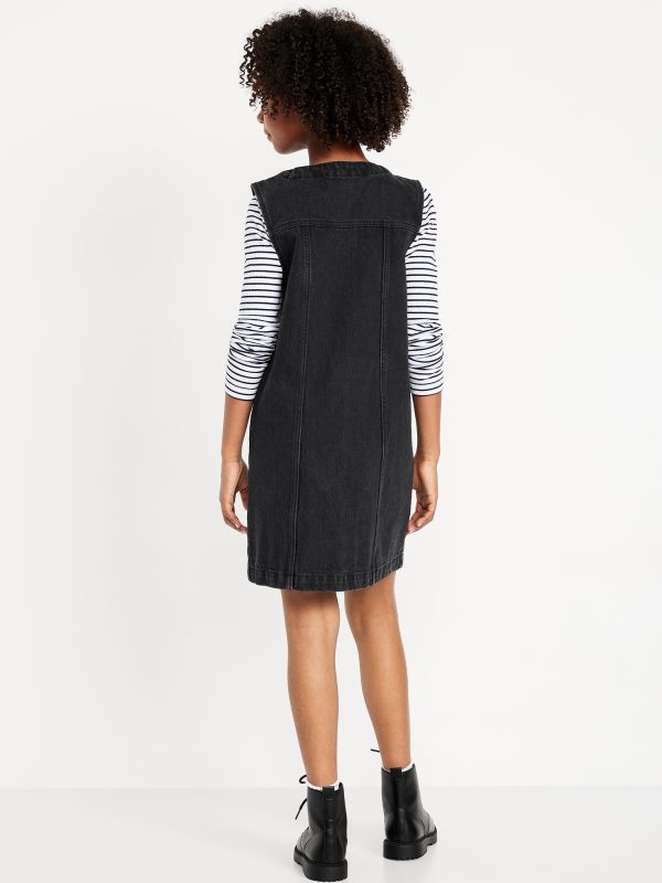Sleeveless Pocket Jean Dress for Girls: v neck, sleeveless, patch pockets at front, full-length snap-button placket in sizes xs-m, full length regular button placket in sizes l-xxl, #803047