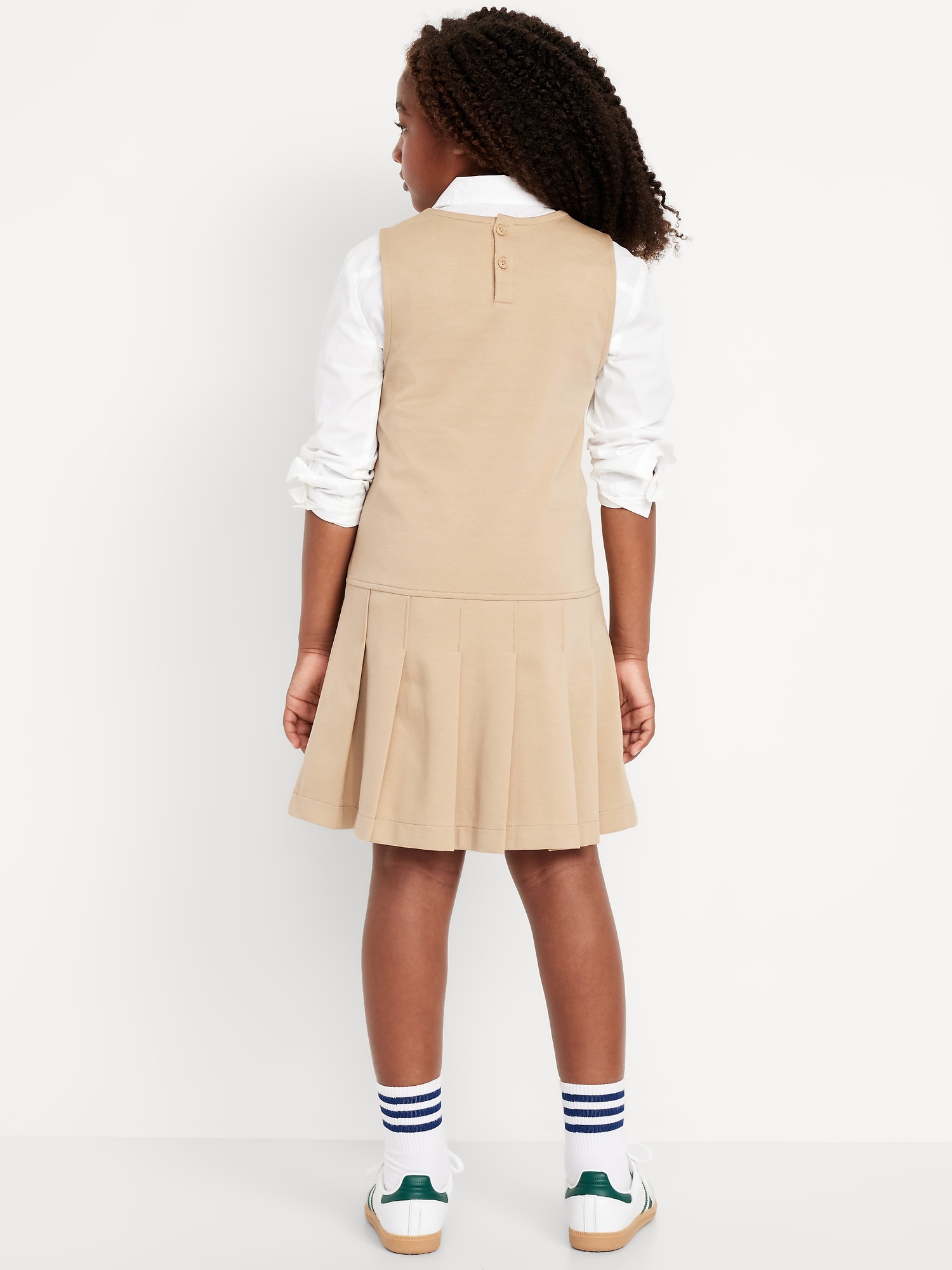 Sleeveless School Uniform Ponte-Knit Dress for Girls: rounded neckline, sleeveless, two-button placket at nape, drop waist, pleated skirt, #766631
