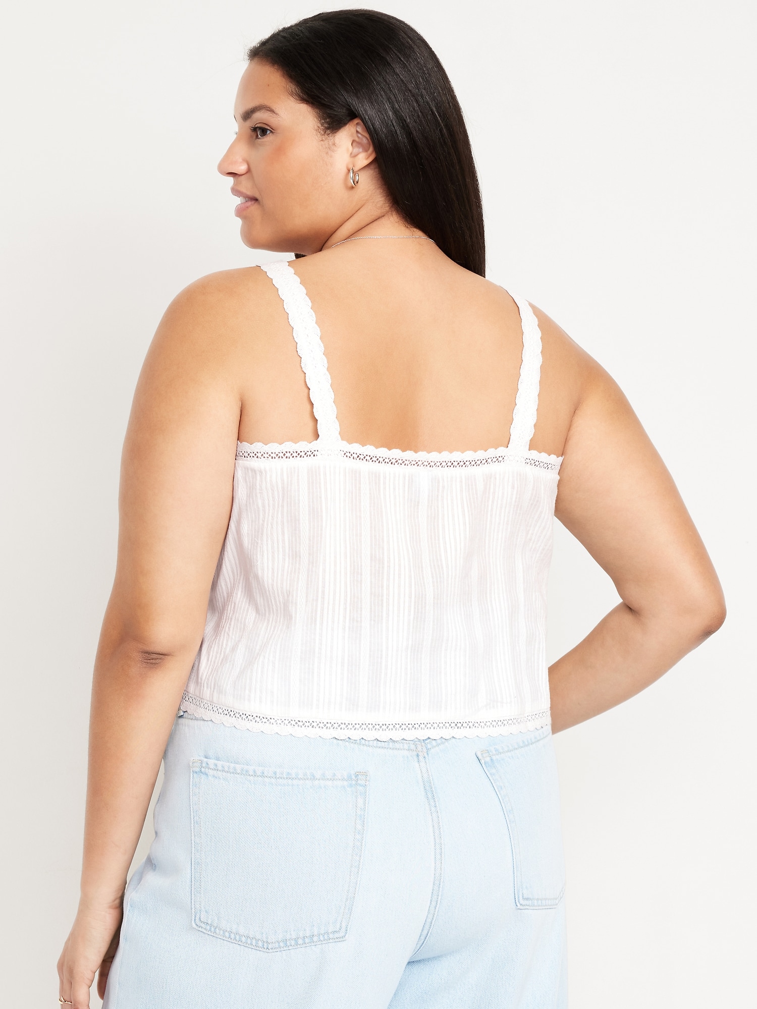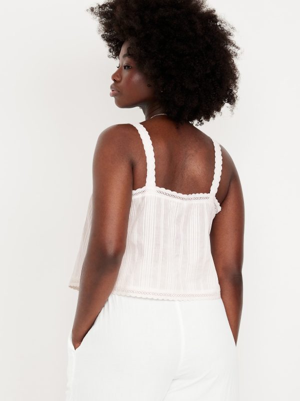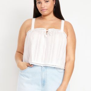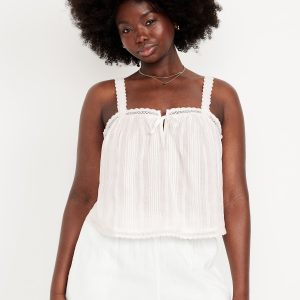 Sleeveless Textured-Dobby Top: wide straps, notched tie-front accent, crochet-lace trim, shirred detail, #764188