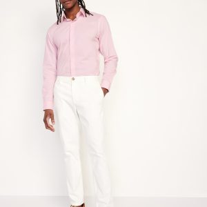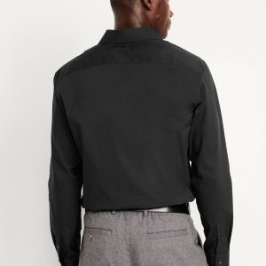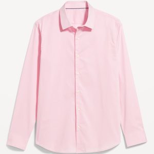 Slim Fit Pro Signature Performance Dress Shirt: 2″ pointed collar, built-in collar stays, long sleeves, buttoned cuffs, full-button front, breathable, quick drying, go-dry wicks moisture, #418101
