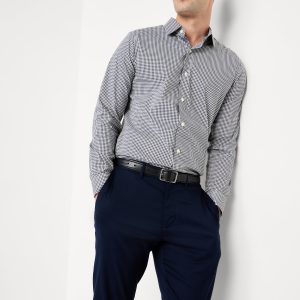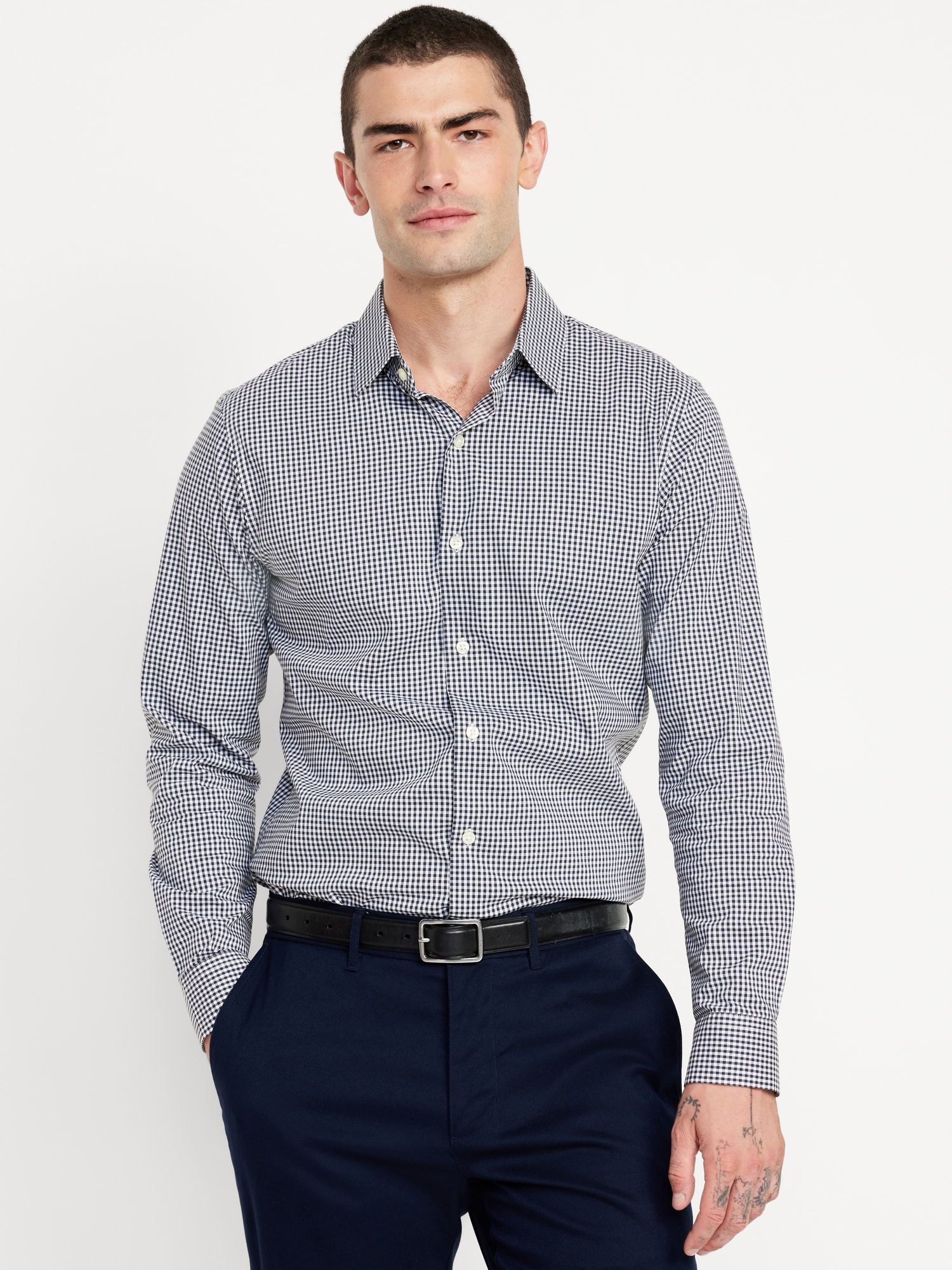 Slim Fit Pro Signature Performance Dress Shirt: 2″ pointed collar, built-in collar stays, long sleeves, buttoned cuffs, full-button front, breathable, quick drying, go-dry wicks moisture, #418101