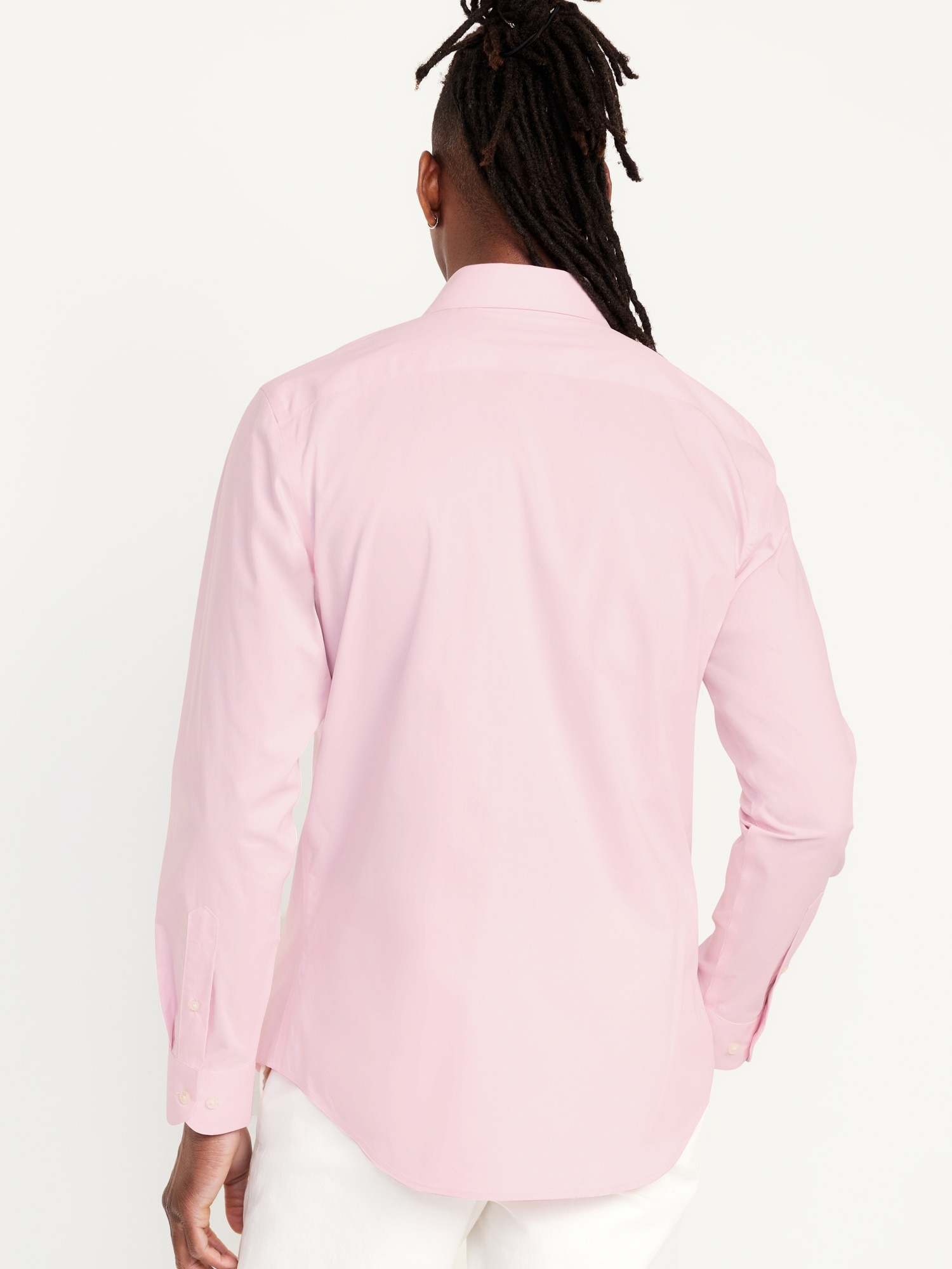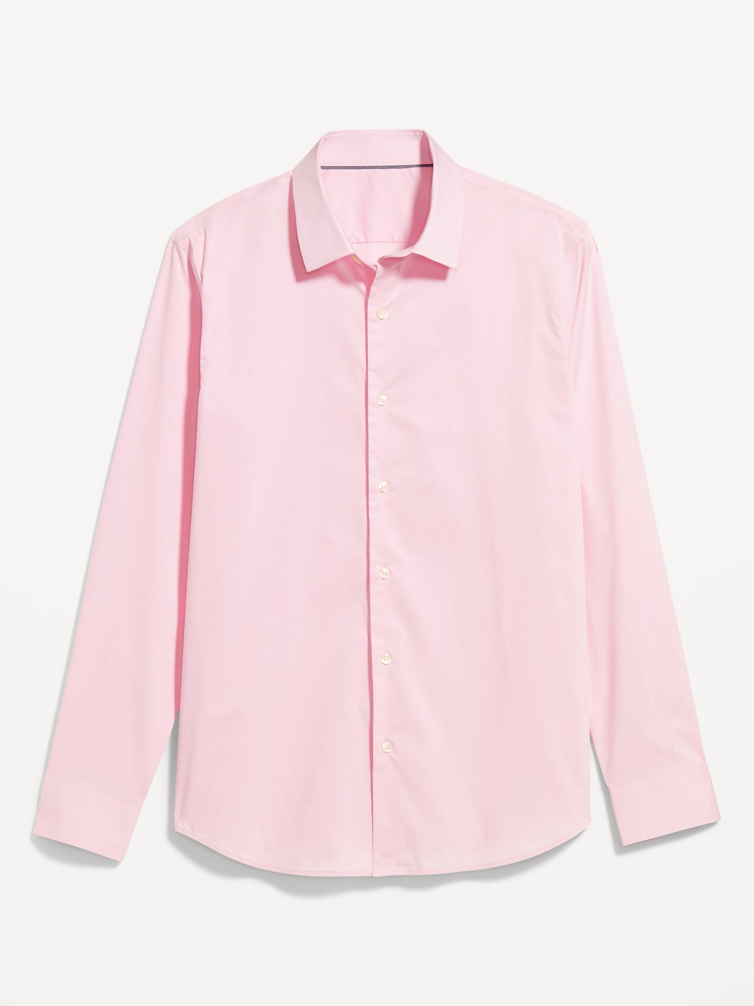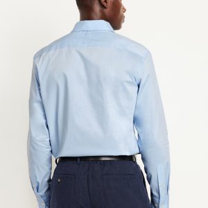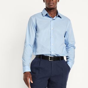 Slim Fit Pro Signature Performance Dress Shirt: 2″ pointed collar, built-in collar stays, long sleeves, buttoned cuffs, full-button front, breathable, quick drying, go-dry wicks moisture, #418101