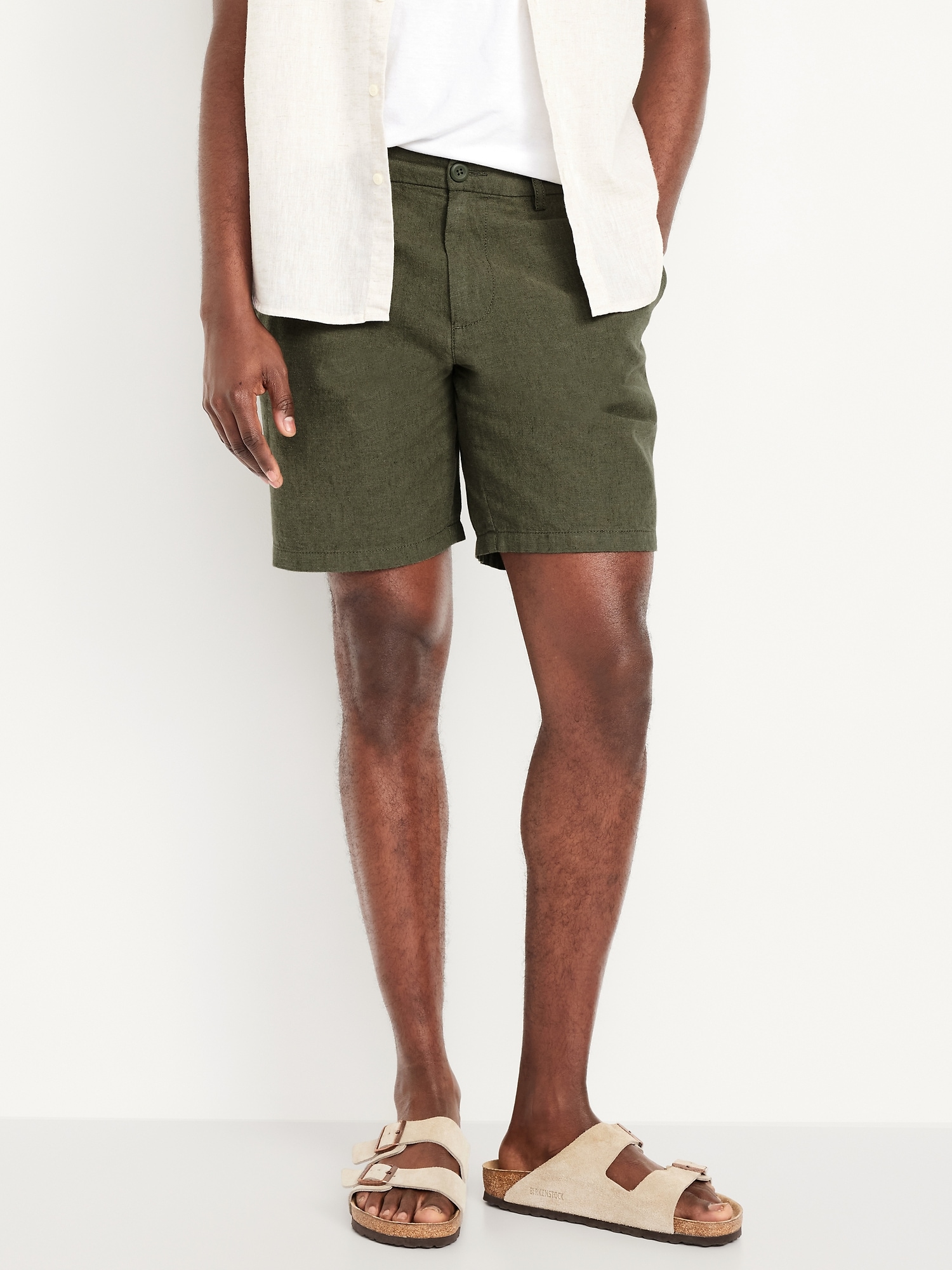 Slim Rotation Linen-Blend Chino Shorts — 8-inch inseam: button front, belt loops, zip fly, on-seam pockets, back welt pockets with button closure at left, #845880