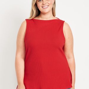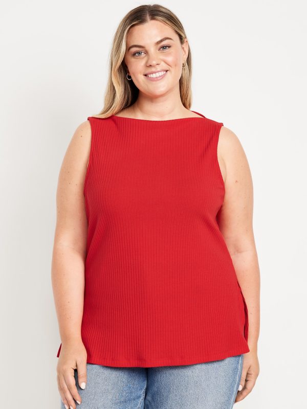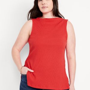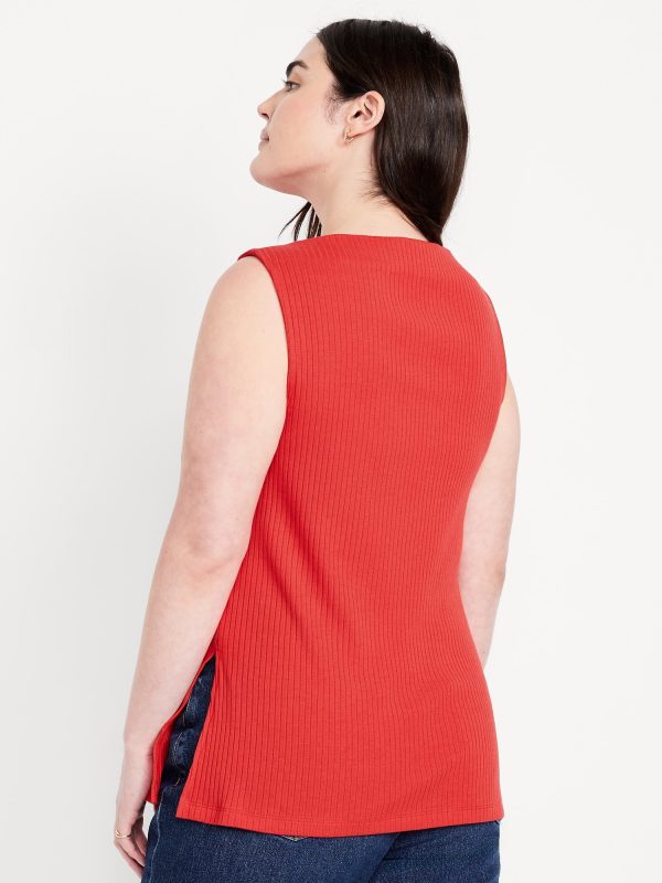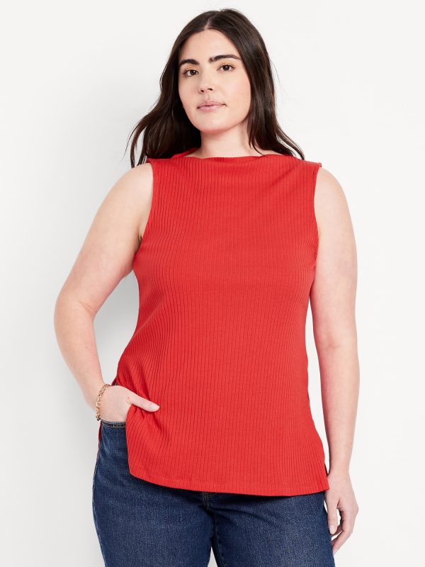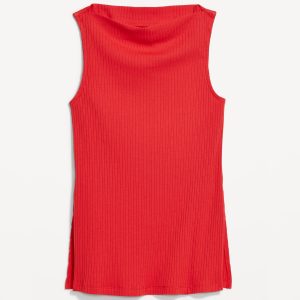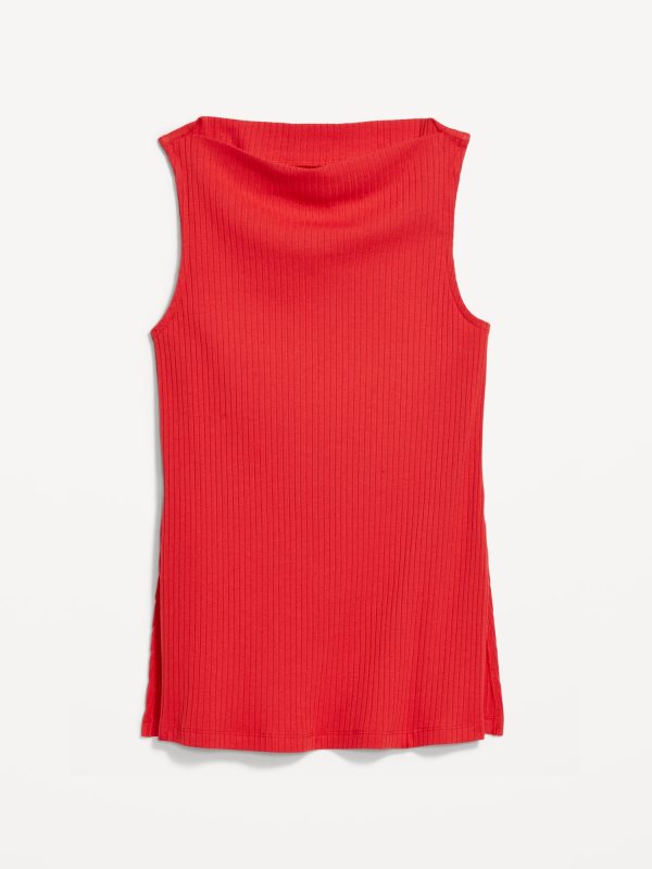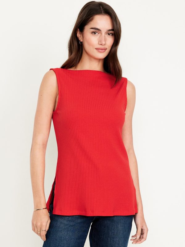 Slit-Neck Ribbed Top: high neck, sleeveless, side slits, #738891