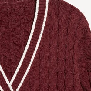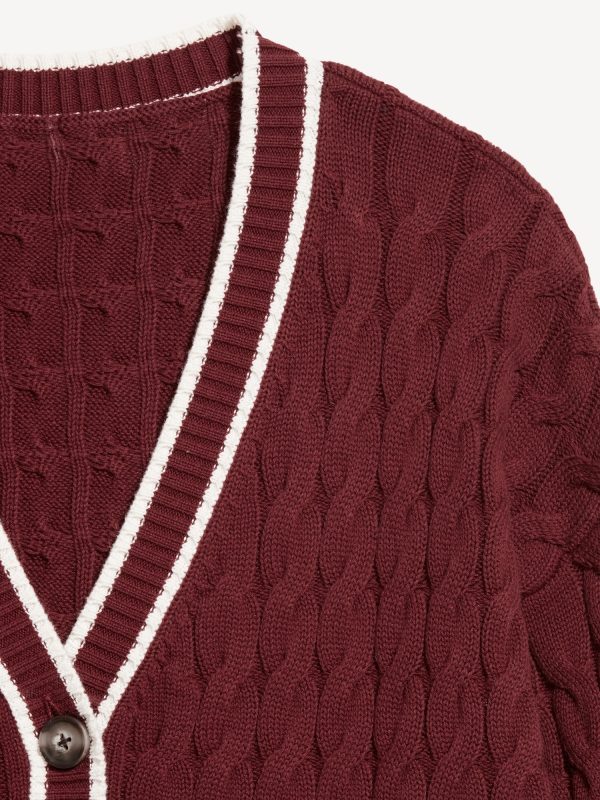 Slouchy Cable-Knit Cardigan Sweater: deep v-neck, long sleeves, button front, contrasting tipped trim, #784426