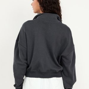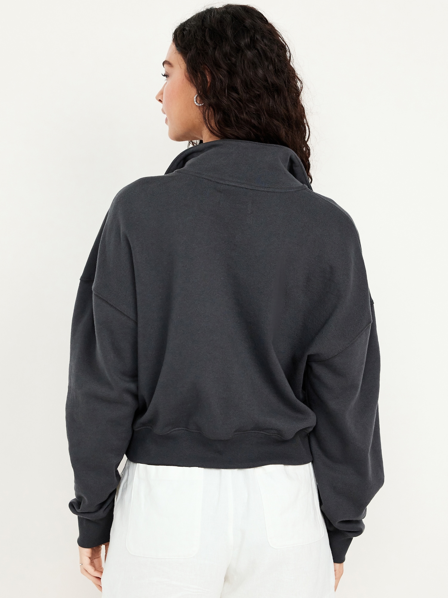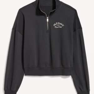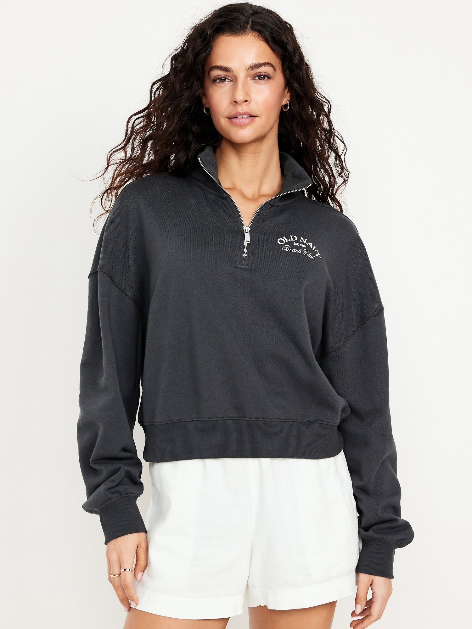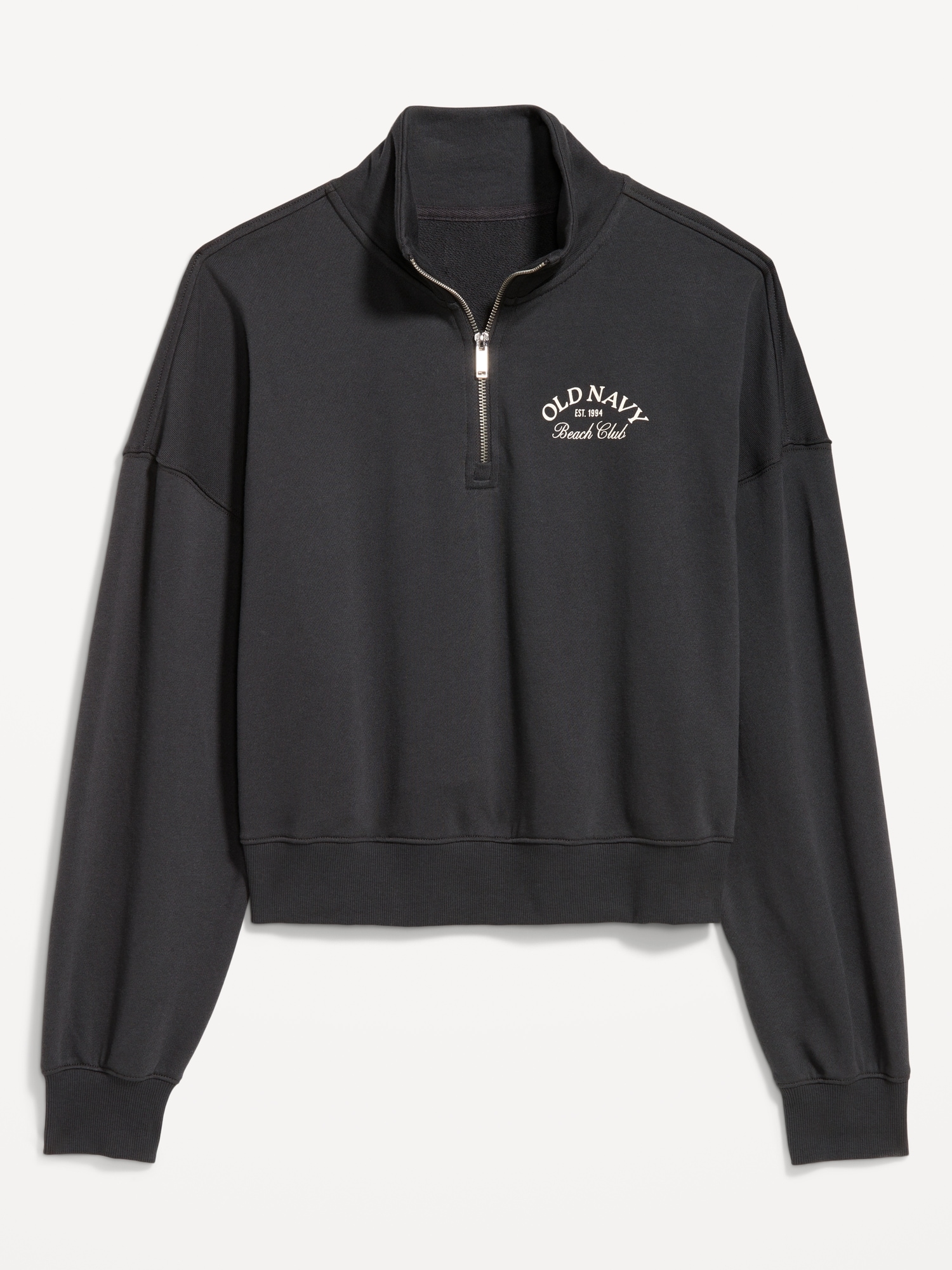 SoComfy Oversized Logo Half-Zip Sweatshirt: The perfect-weight, never-taking-this-off fleece.available exclusively online and at old navy outlets, mock neck, half-zip front, long drop-shoulder sleeves, logo graphic, rib-knit trim, pullover style, #684716
