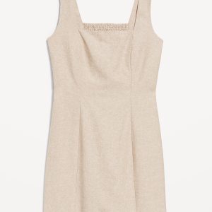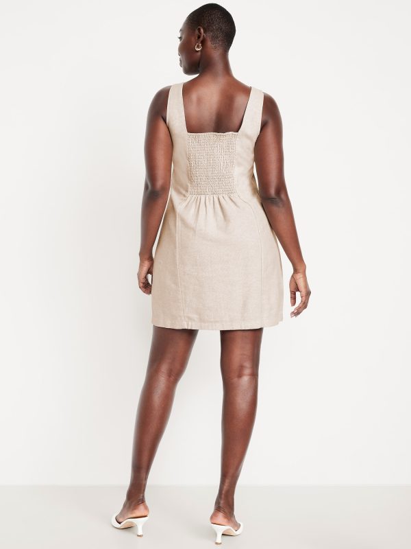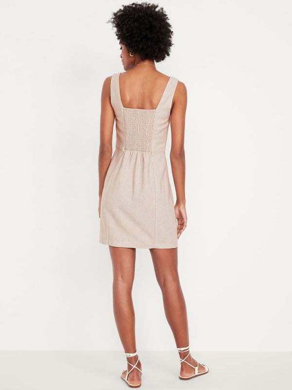 Square-Neck Linen-Blend Mini Dress: square neck, wide straps, smocked back, princess seams, mini length, gingham print, #708450