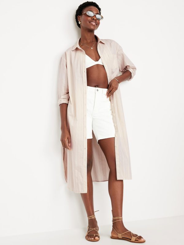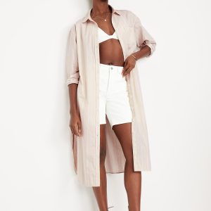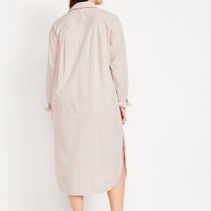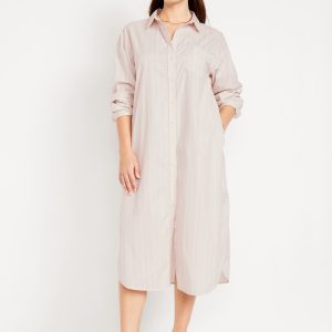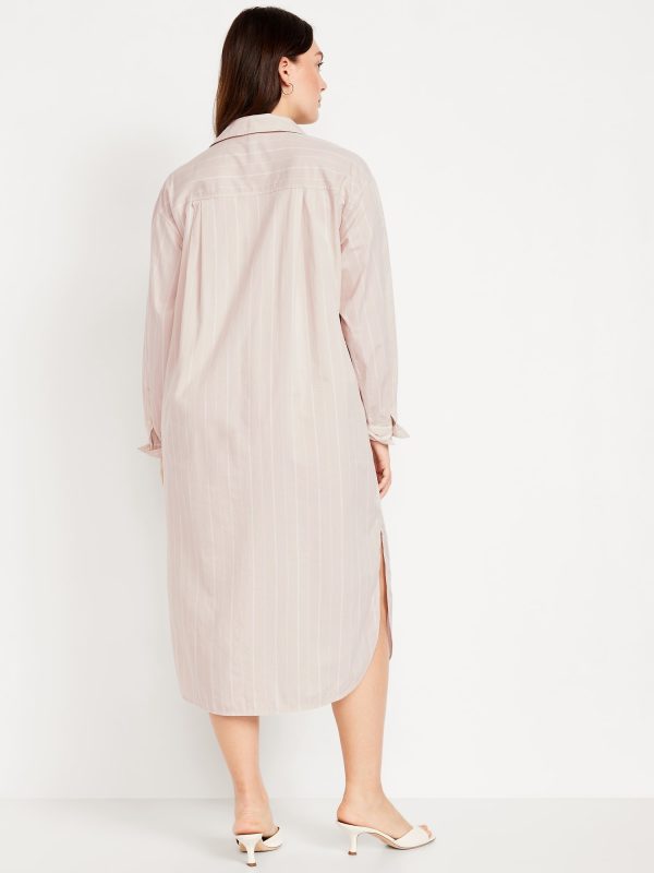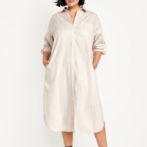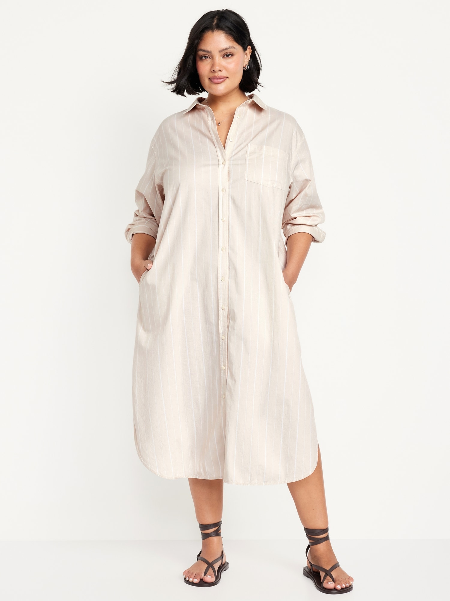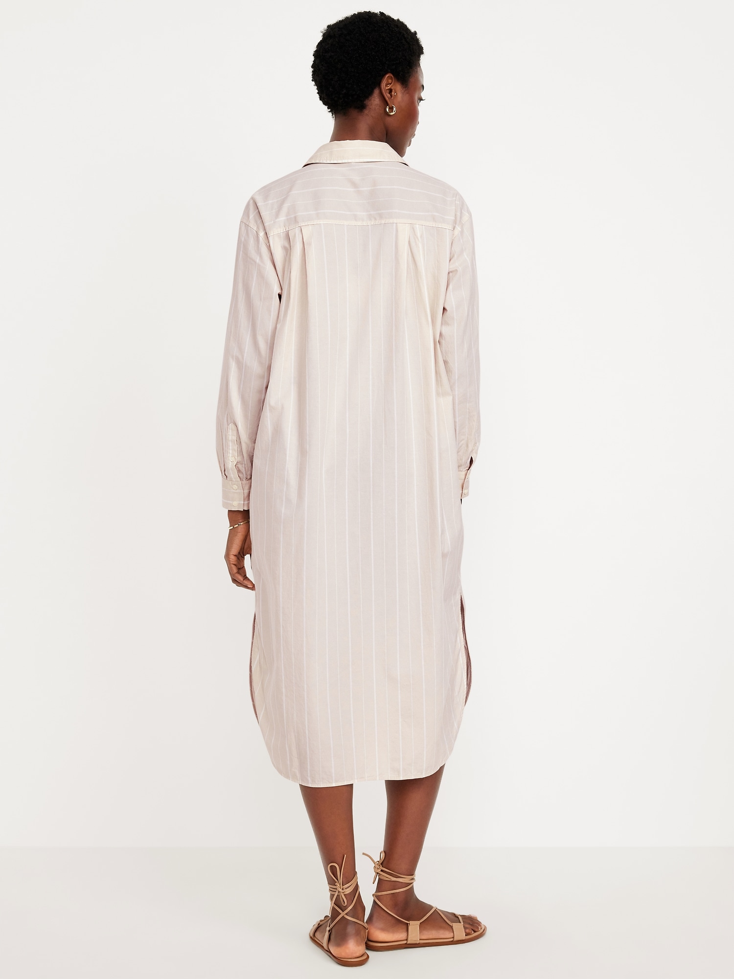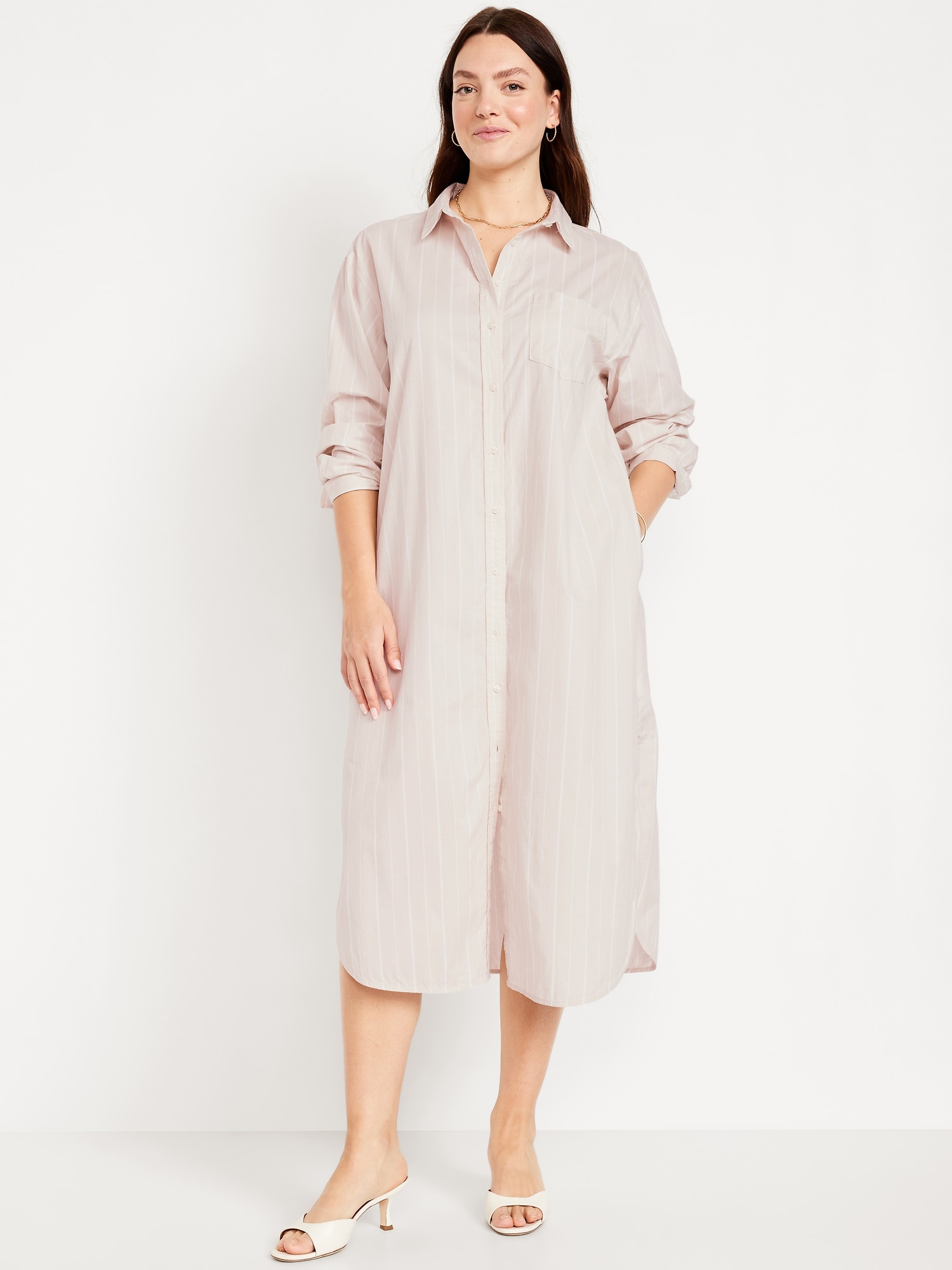 Striped Midi Shirt Dress: spread collar, long sleeves, buttoned cuffs, full-button front, patch chest pocket, vertical striped print, #726208