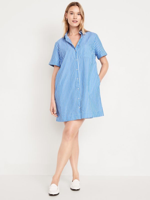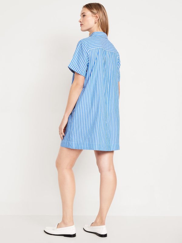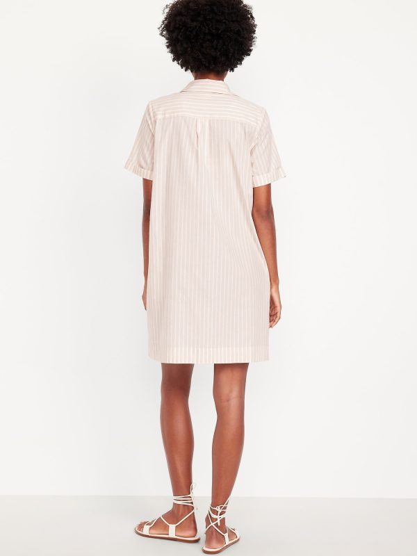 Striped Mini Shirt Dress: spread collar, short sleeves, side-seam pockets, patch chest pocket, full-button front, #705355