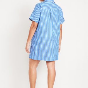 Striped Mini Shirt Dress: spread collar, short sleeves, side-seam pockets, patch chest pocket, full-button front, #705355