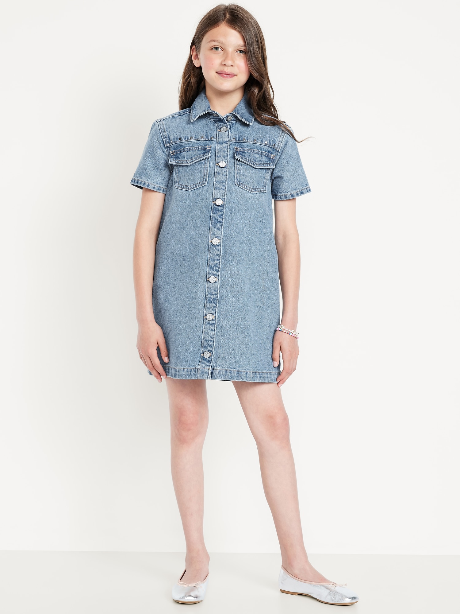 Studded Pocket Jean Shirt Dress for Girls: pointed collar, short sleeves, flap pockets at chest, studs at chest, full-length snap-button placket in sizes xs-m, full length regular button placket in sizes l-xxl, #802952