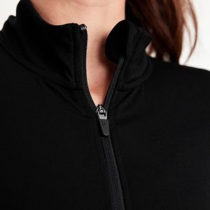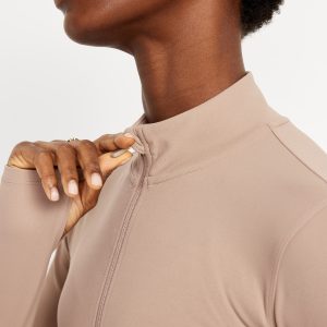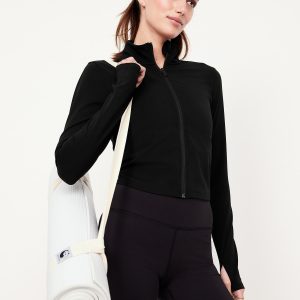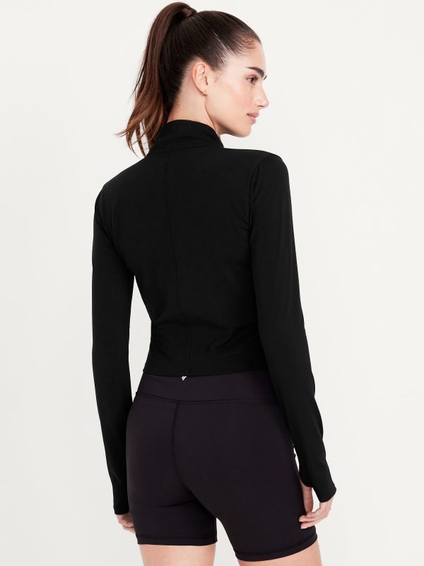 StudioSmooth Crop Full Zip: Featuring StudioSmooth. Buttery soft and breathable, with a barely-there feel.mock neck, long sleeves, thumbhole cuffs, zip front, go-dry wicks moisture, #663729