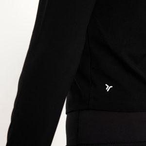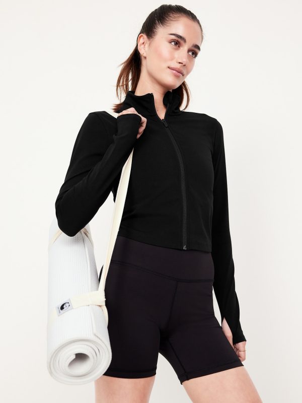 StudioSmooth Crop Full Zip: Featuring StudioSmooth. Buttery soft and breathable, with a barely-there feel.mock neck, long sleeves, thumbhole cuffs, zip front, go-dry wicks moisture, #663729