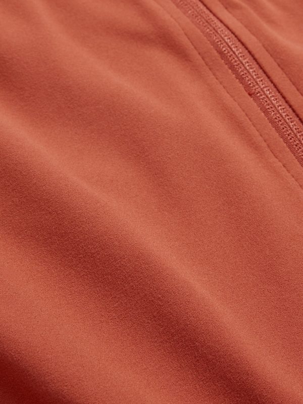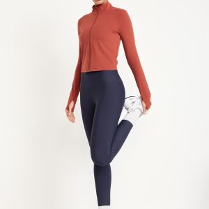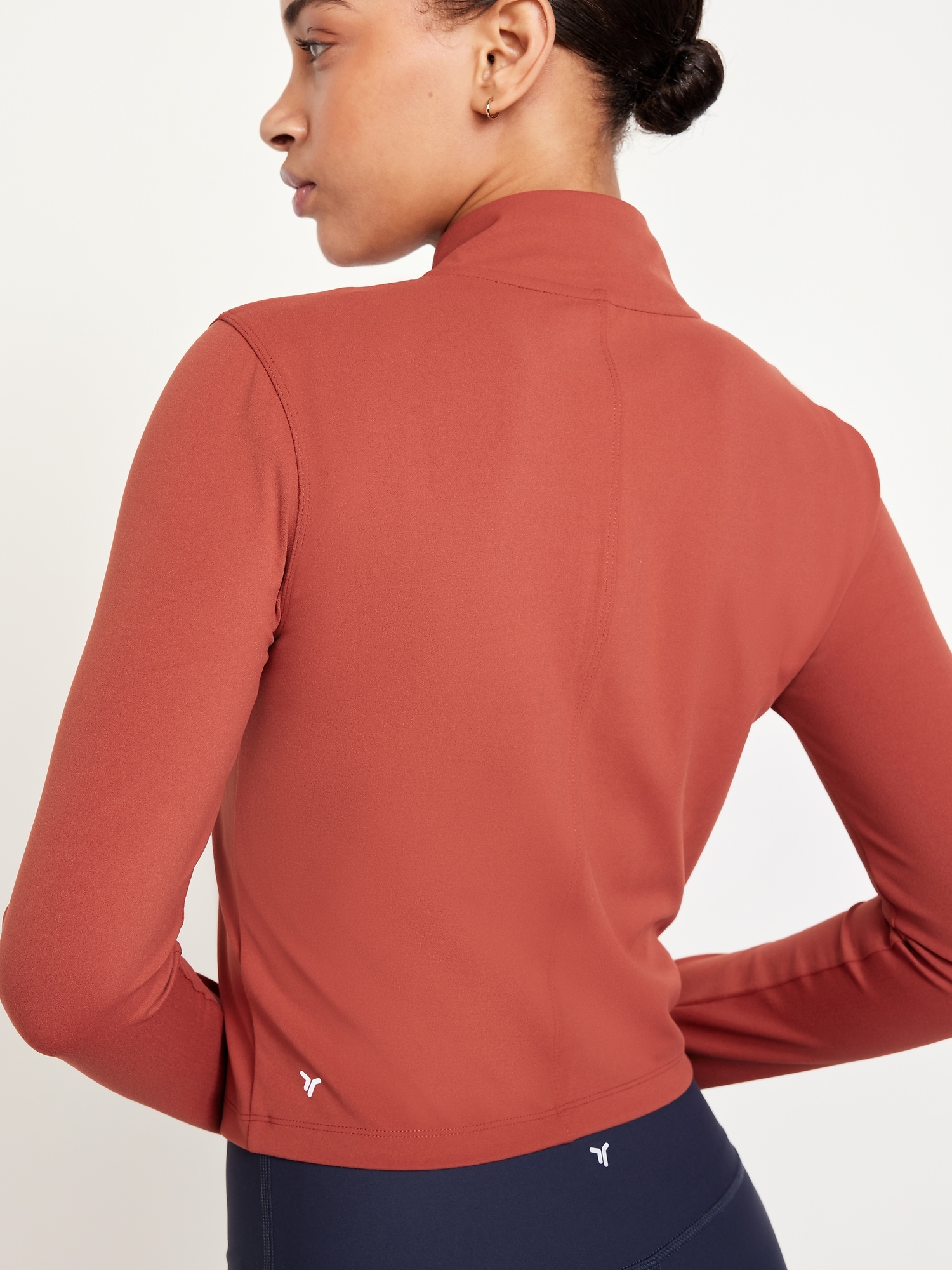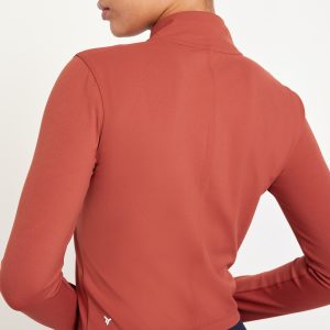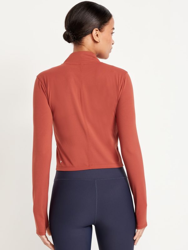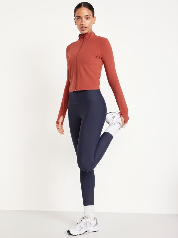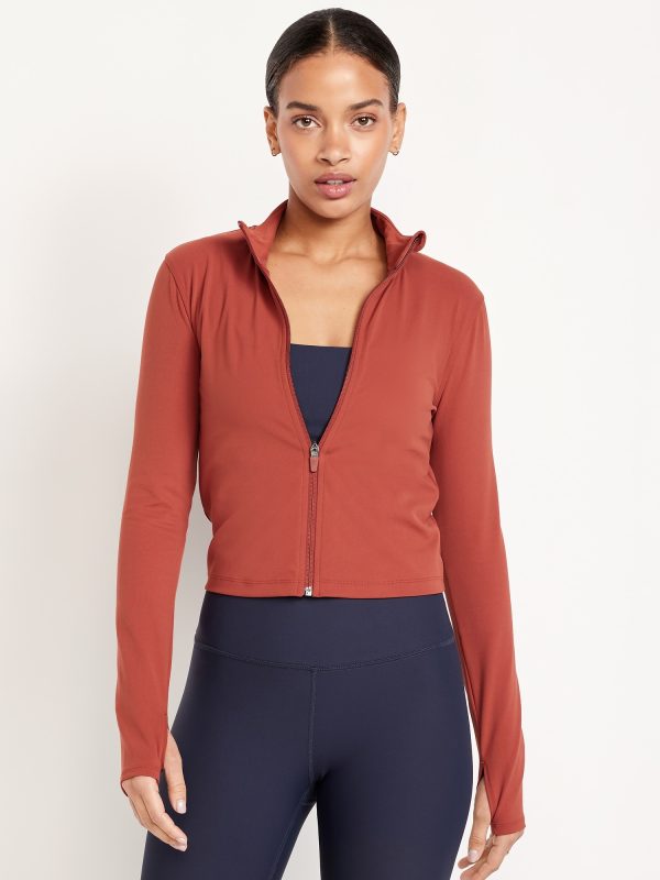 StudioSmooth Crop Full Zip: Featuring StudioSmooth. Buttery soft and breathable, with a barely-there feel.mock neck, long sleeves, thumbhole cuffs, zip front, go-dry wicks moisture, #663729