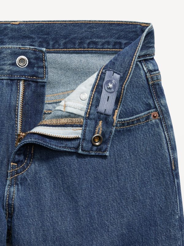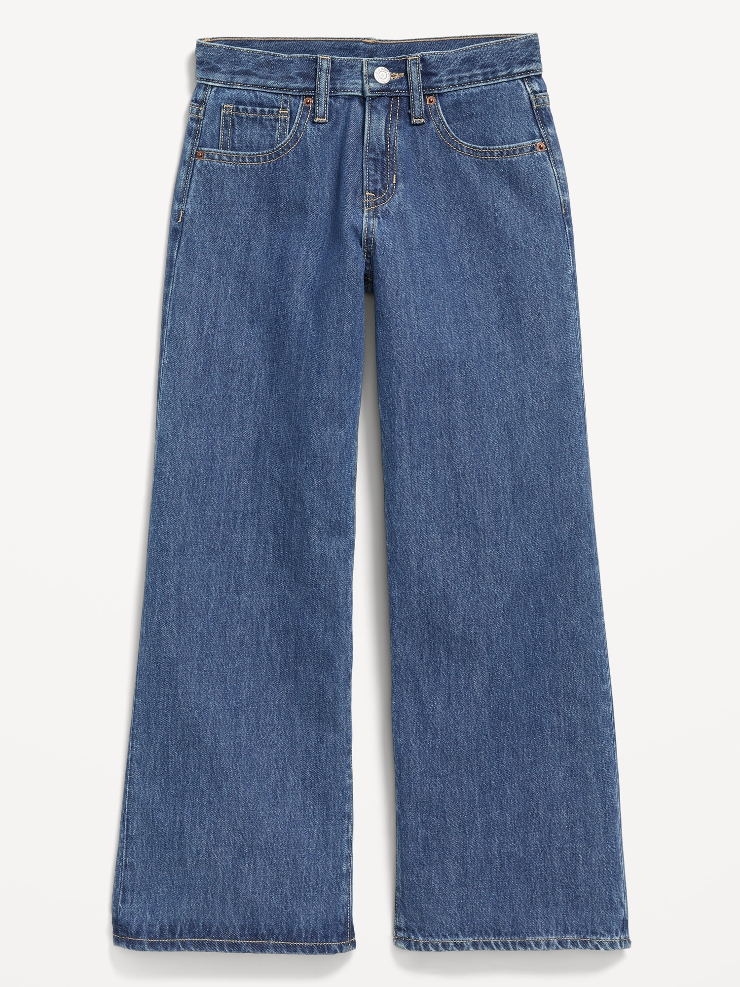 Super Baggy Wide-Leg Jeans for Girls: mid rise, interior adjustable waistband, crossover waist, snap button closures (sizes 5-8), regular button closures (sizes 10-20), zip fly, scoop pockets and coin pocket, patch pockets at back, wide leg, embroidered stars, #803761