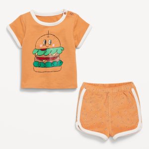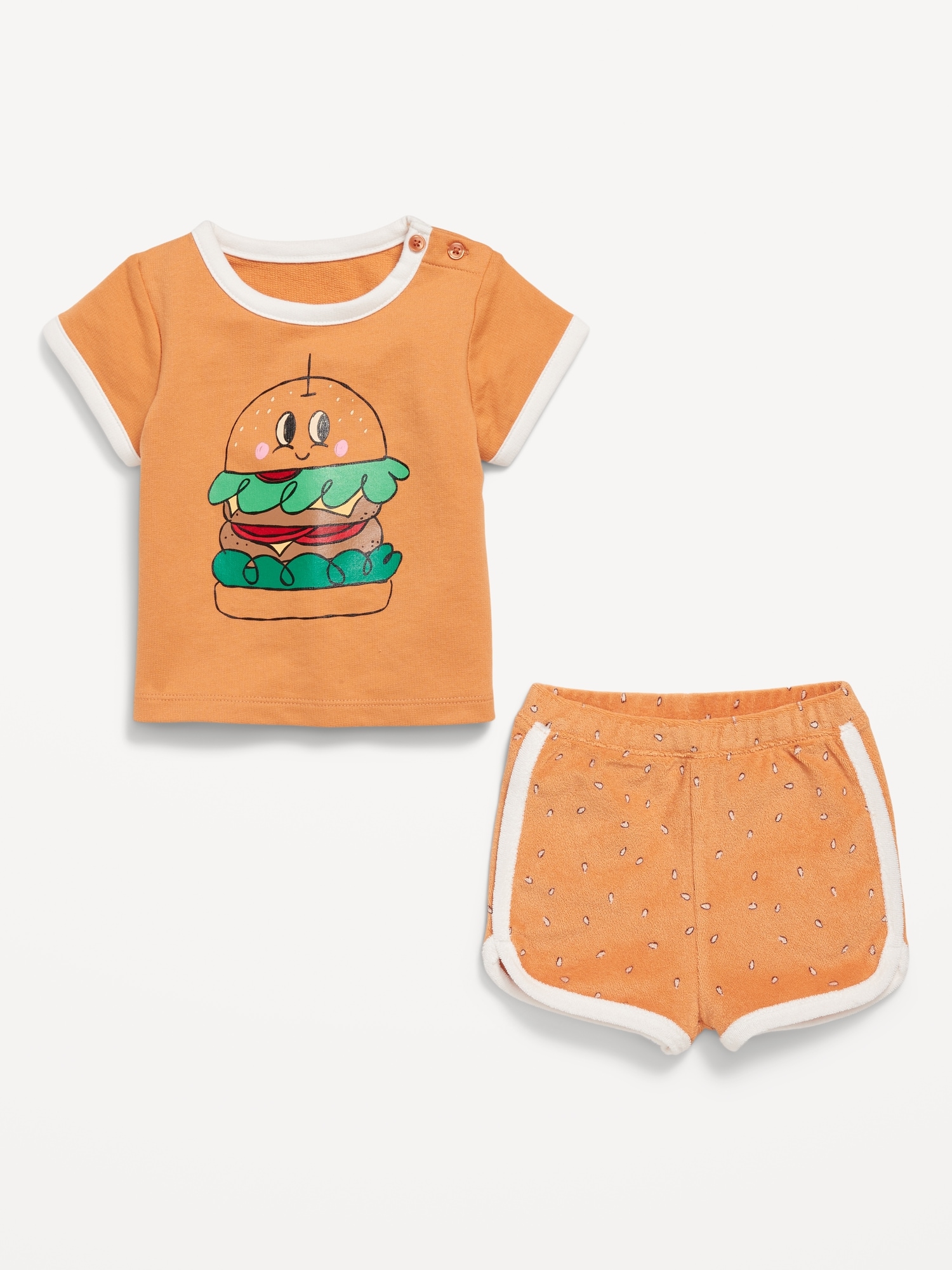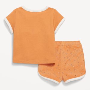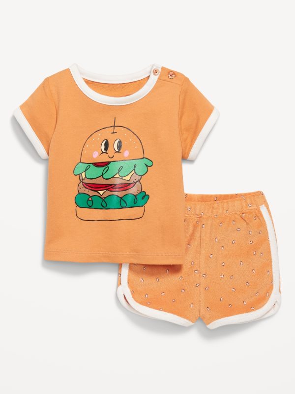 Terry Ringer Graphic T-Shirt and Shorts Set for Baby: crew neck with buttons at shoulder, dolman sleeves, front graphic, functional elastic-drawstring waist shorts, available exclusively online and at old navy outlets, #766737