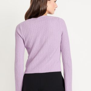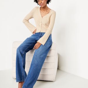 Textured Bouclé Button-Down Sweater: deep v-neck, long bell sleeves, button front, #761519
