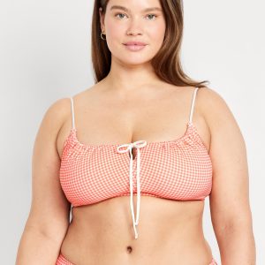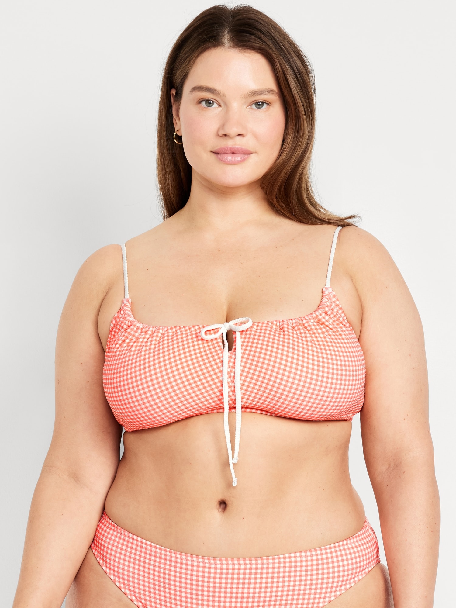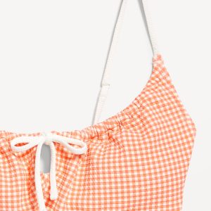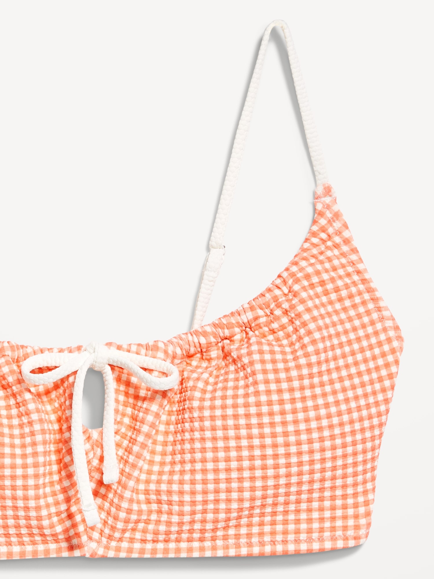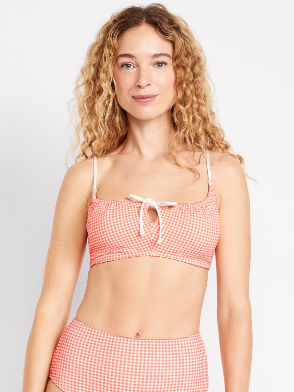 Textured Gingham Bikini Swim Top: adjustable spaghetti straps, scoop neck, tie-front keyhole accent, ruched bodice, removable pads, back clasp, gingham print, #685285