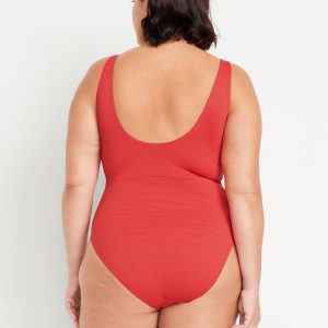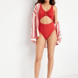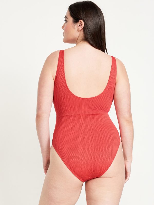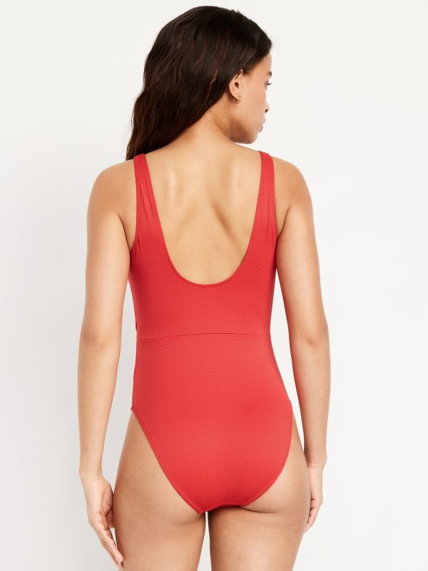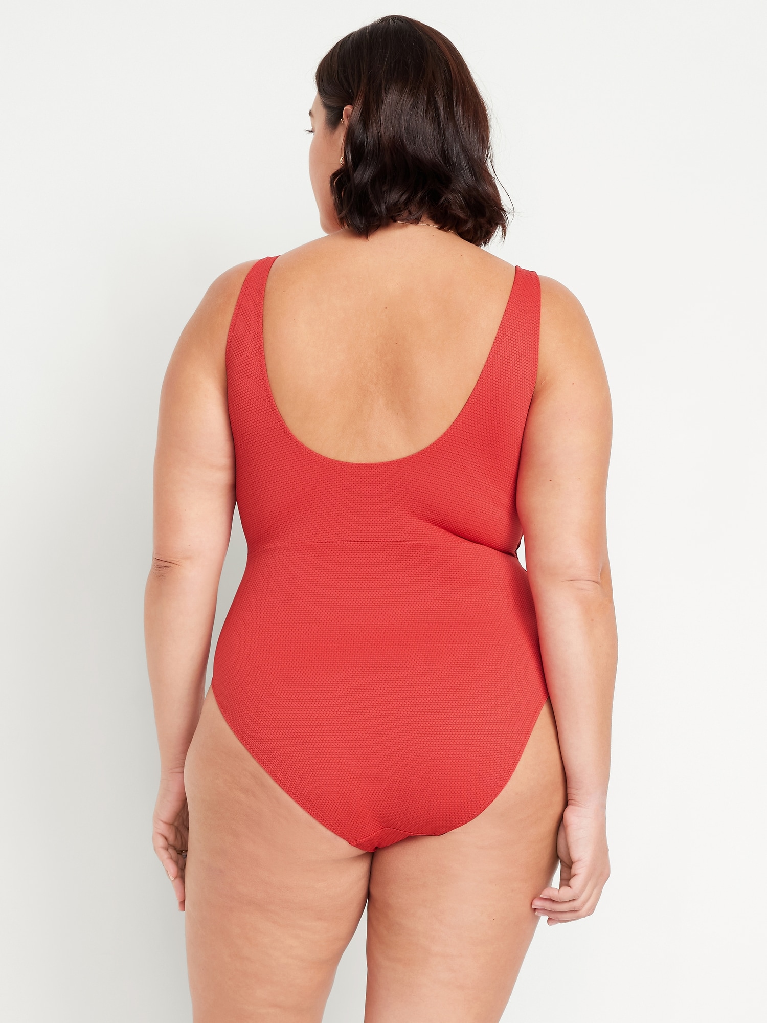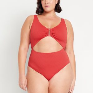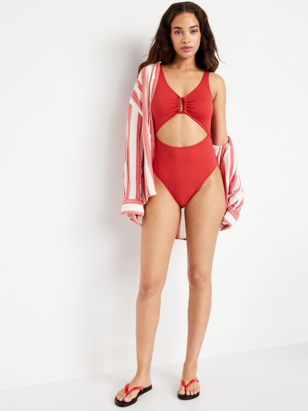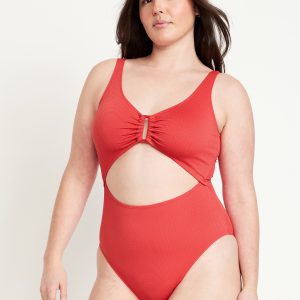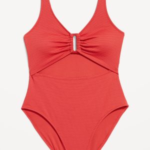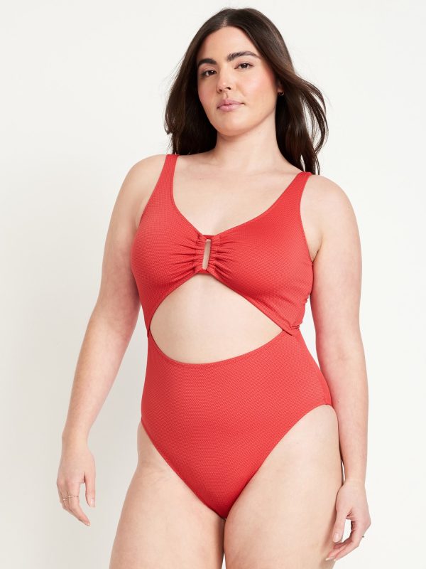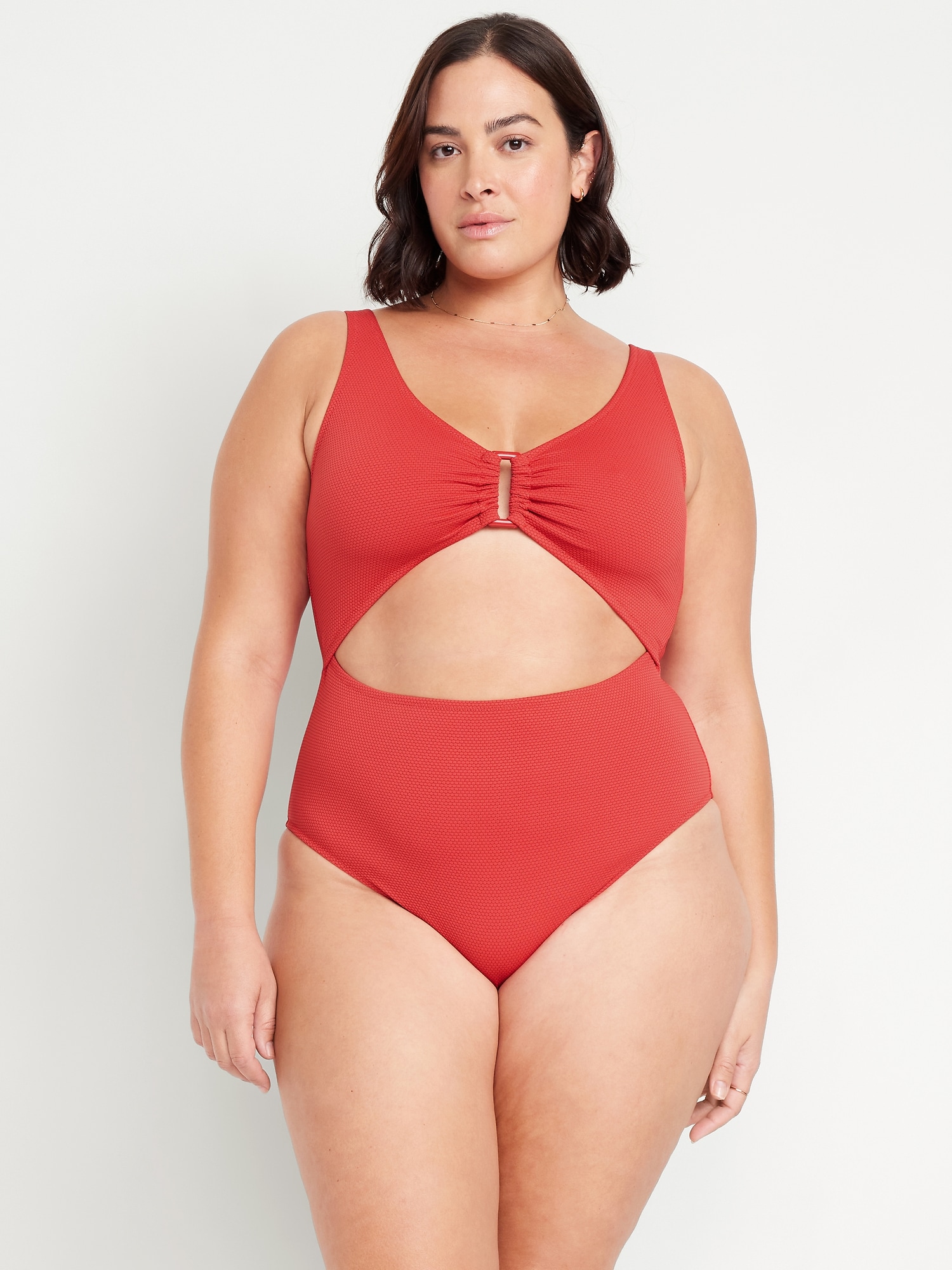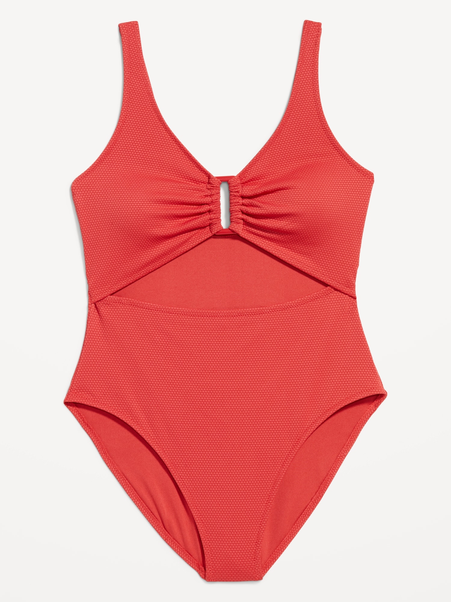 Textured One-Piece Cut-Out Swimsuit: v-neck, wide straps, scoop back, removable pads, cut-out front, elasticized leg openings, #660700