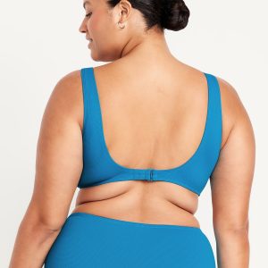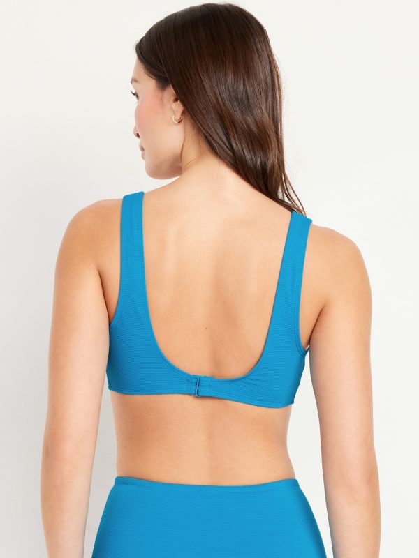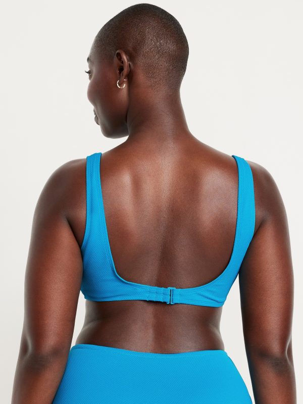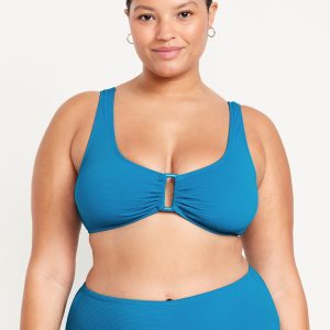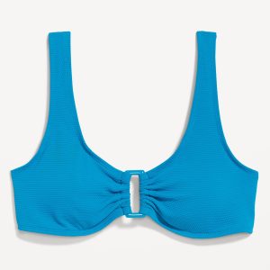 Textured Swim Top: scoop neck, wide straps, ruched front with o-ring accent, removable cups, hook-and-eye clasp at back, #660878