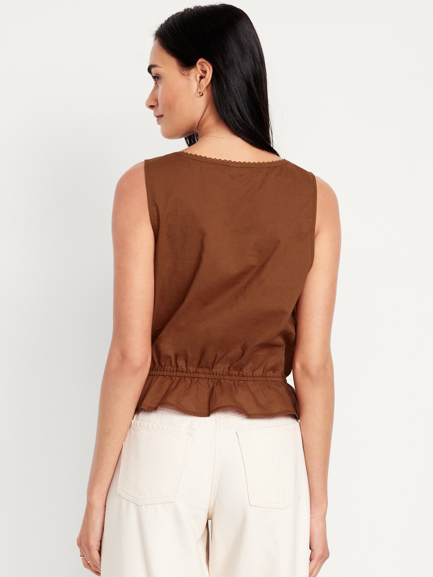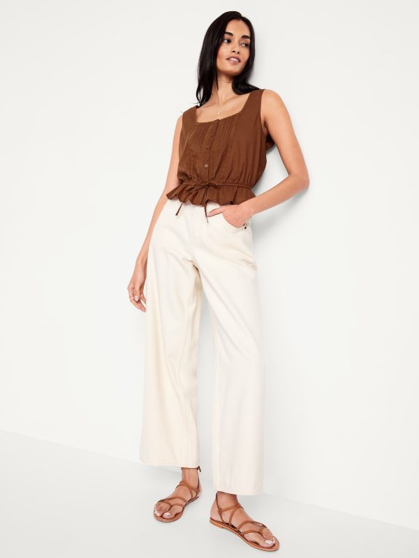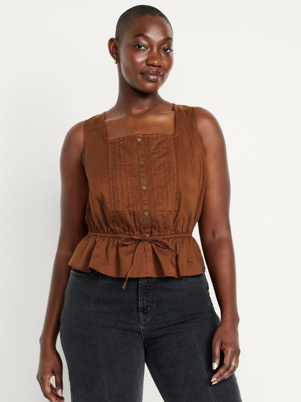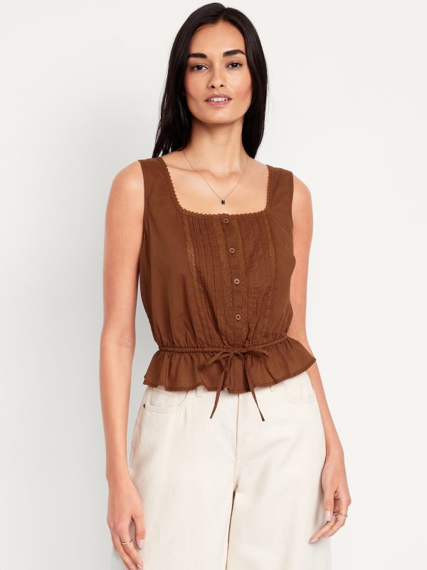 Tie-Waist Lace-Trim Top: picot lace-trim square neck, wide straps, five-button front, elastic tie-belt waist, #705128