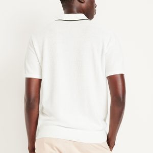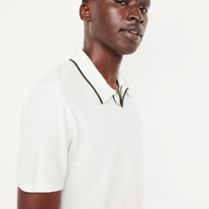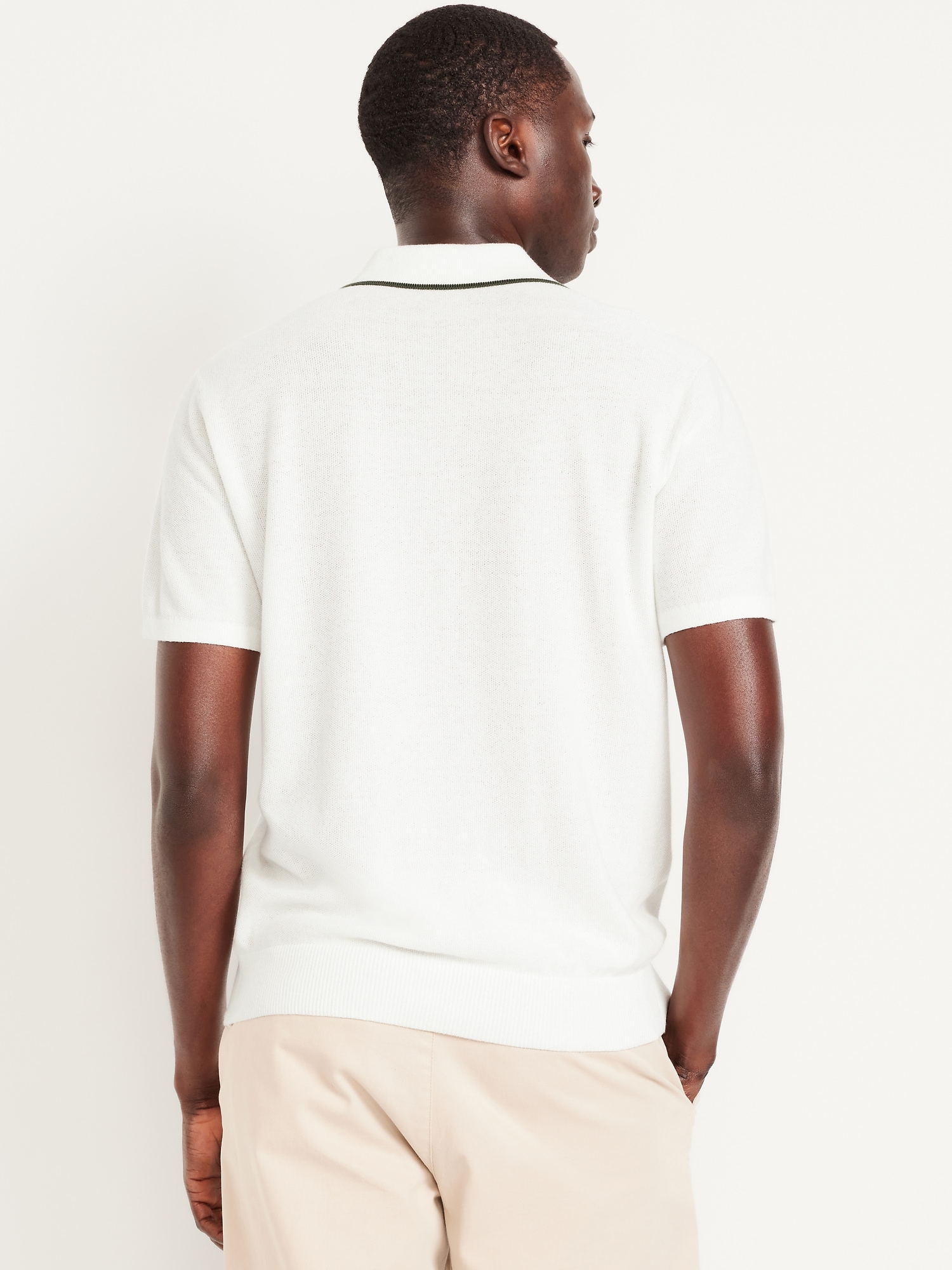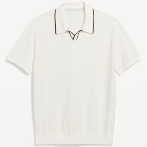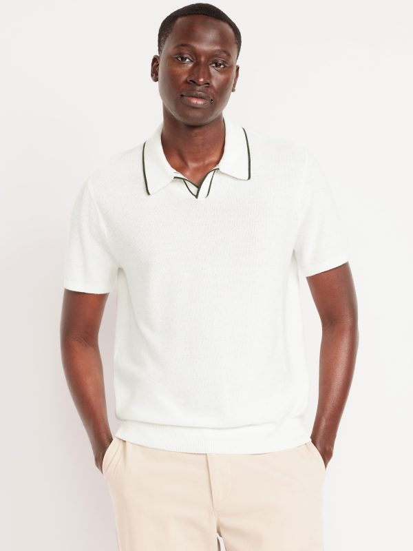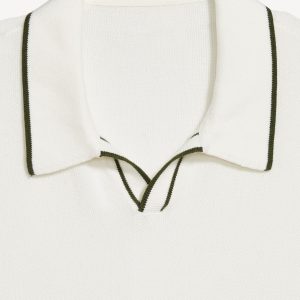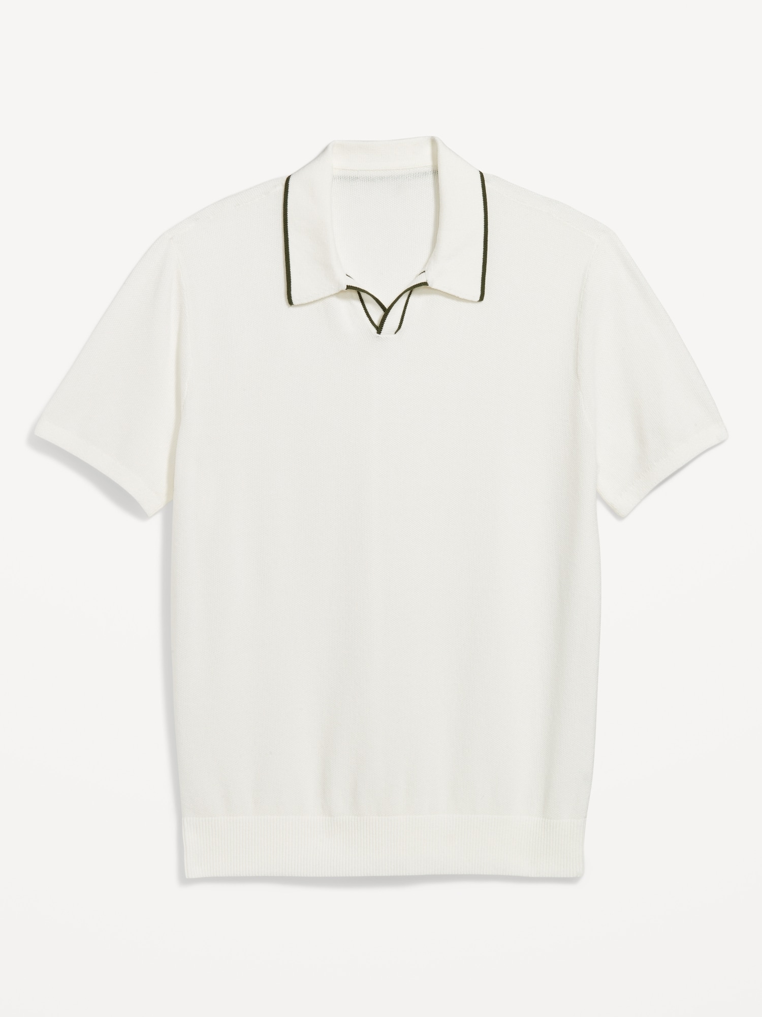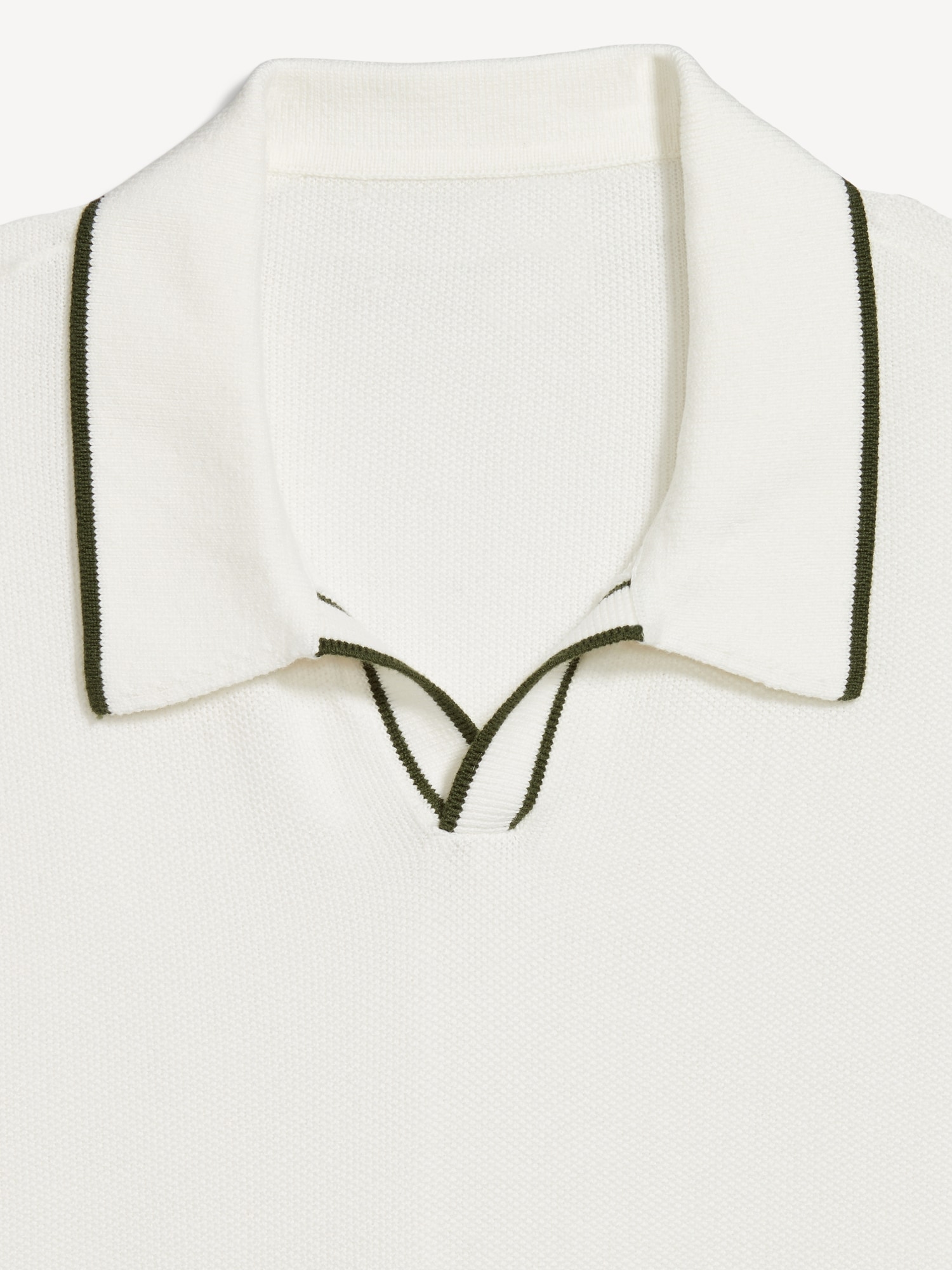 Tipped Collar Polo Sweater: spread collar, short sleeves, buttoned placket, pullover style, #802042
