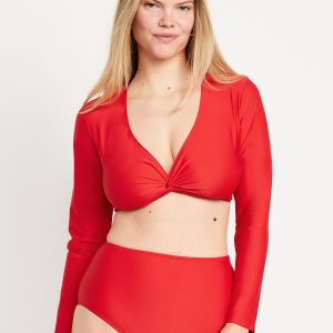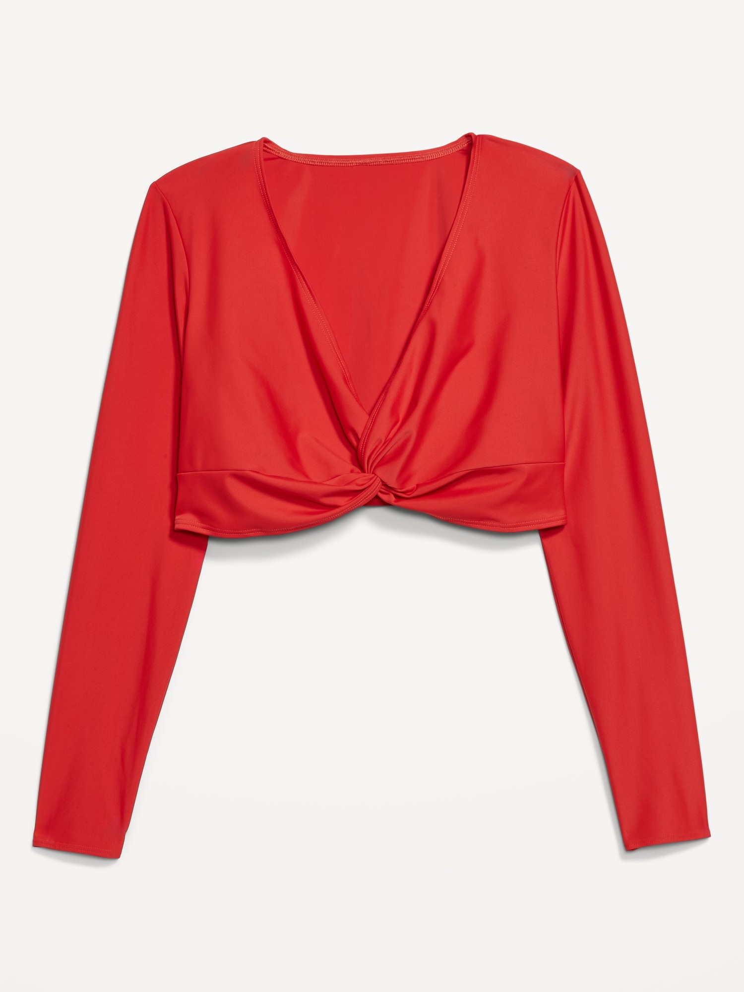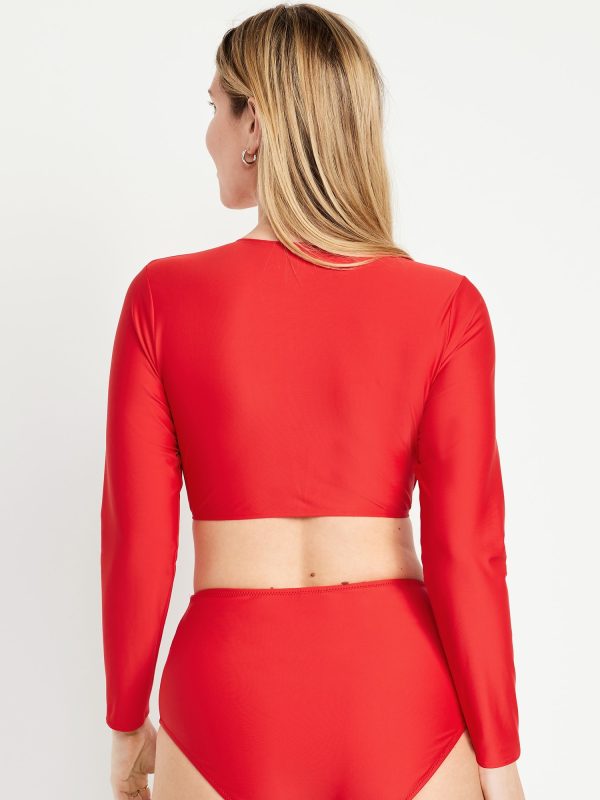 Twist-Front Matte Rashguard Swim Top: deep v-neck, long sleeves, twist-front accent, #747909