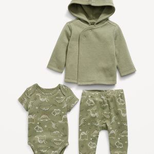 Unisex 3-Piece Dino-Print Layette Set for Baby: bodysuit has envelope neckline, short sleeves, snaps along inseam, pants have elasticized waistband, sewn-in feet, hooded jacket has kimono style, double-breasted four-snap wrap front, online exclusive, #867901