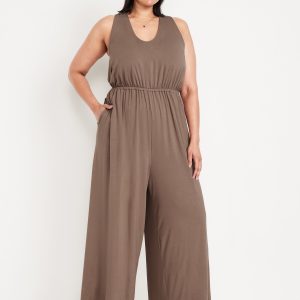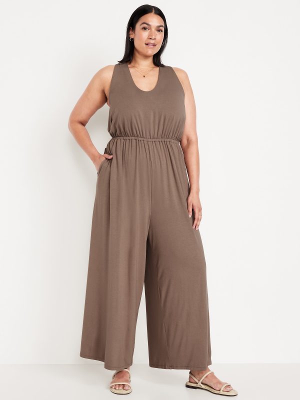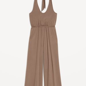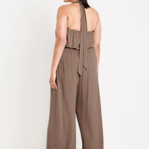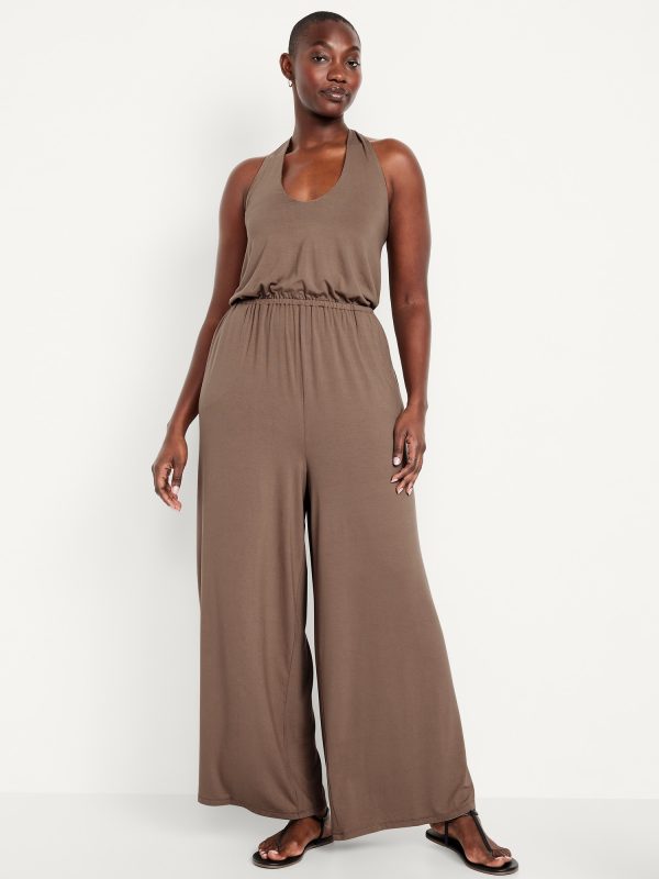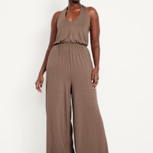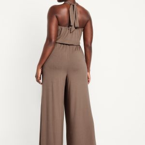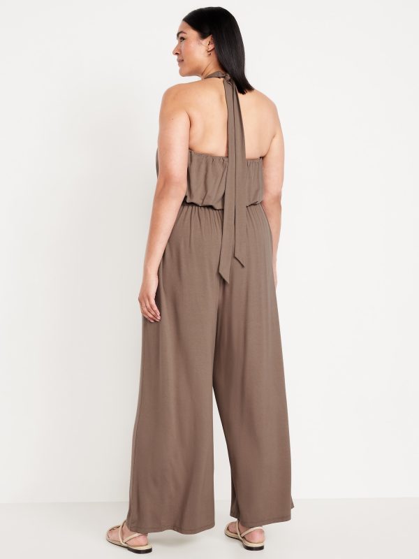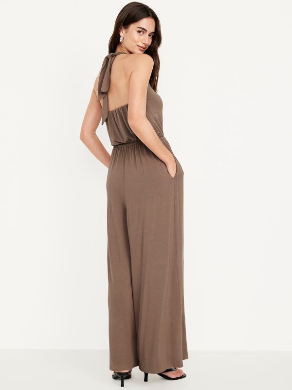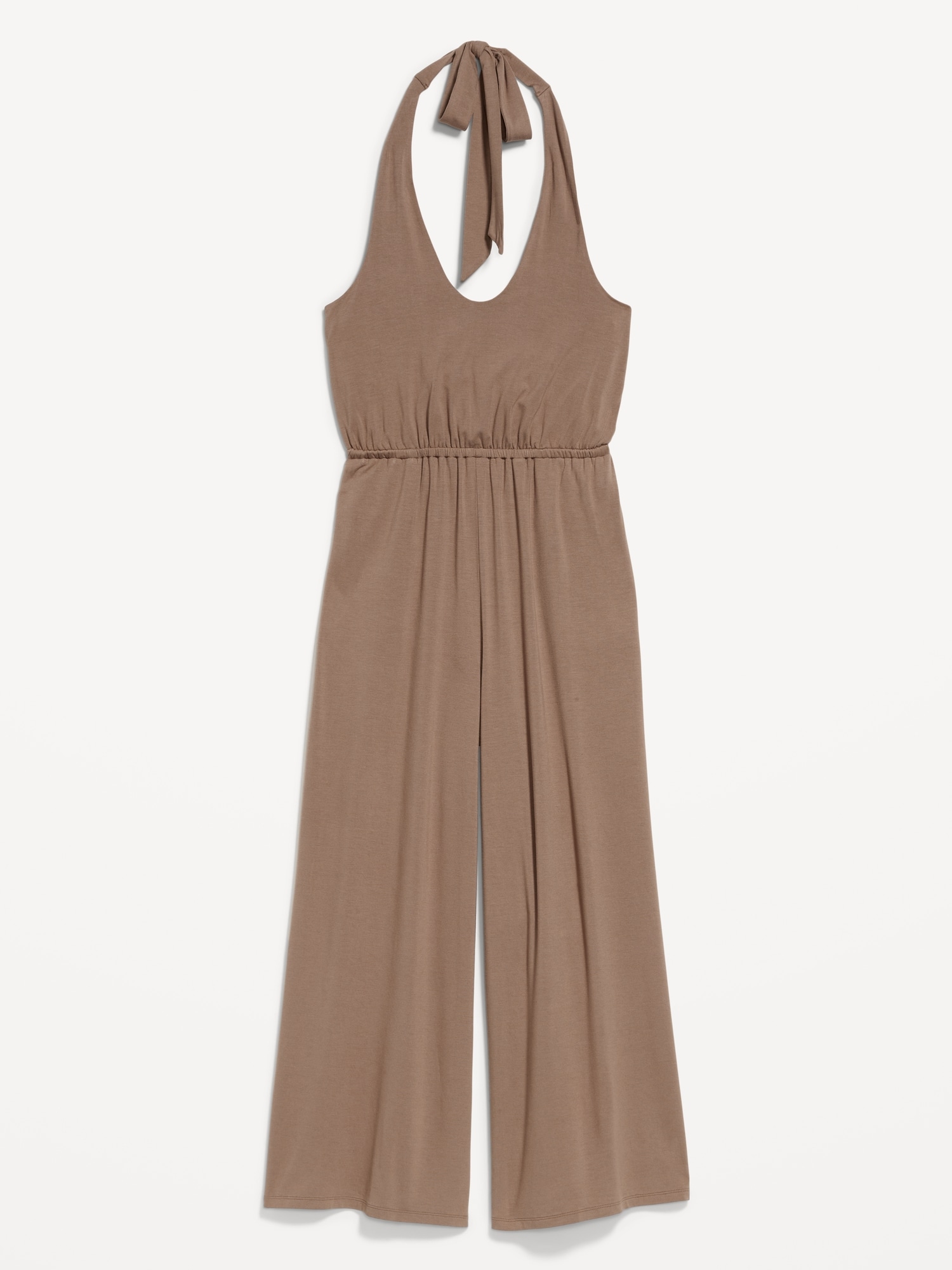Waist-Defined Halter Jumpsuit: scoop neck, tie-back halter straps, shirred elastic waist, wide leg, #705487