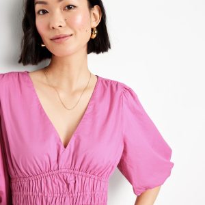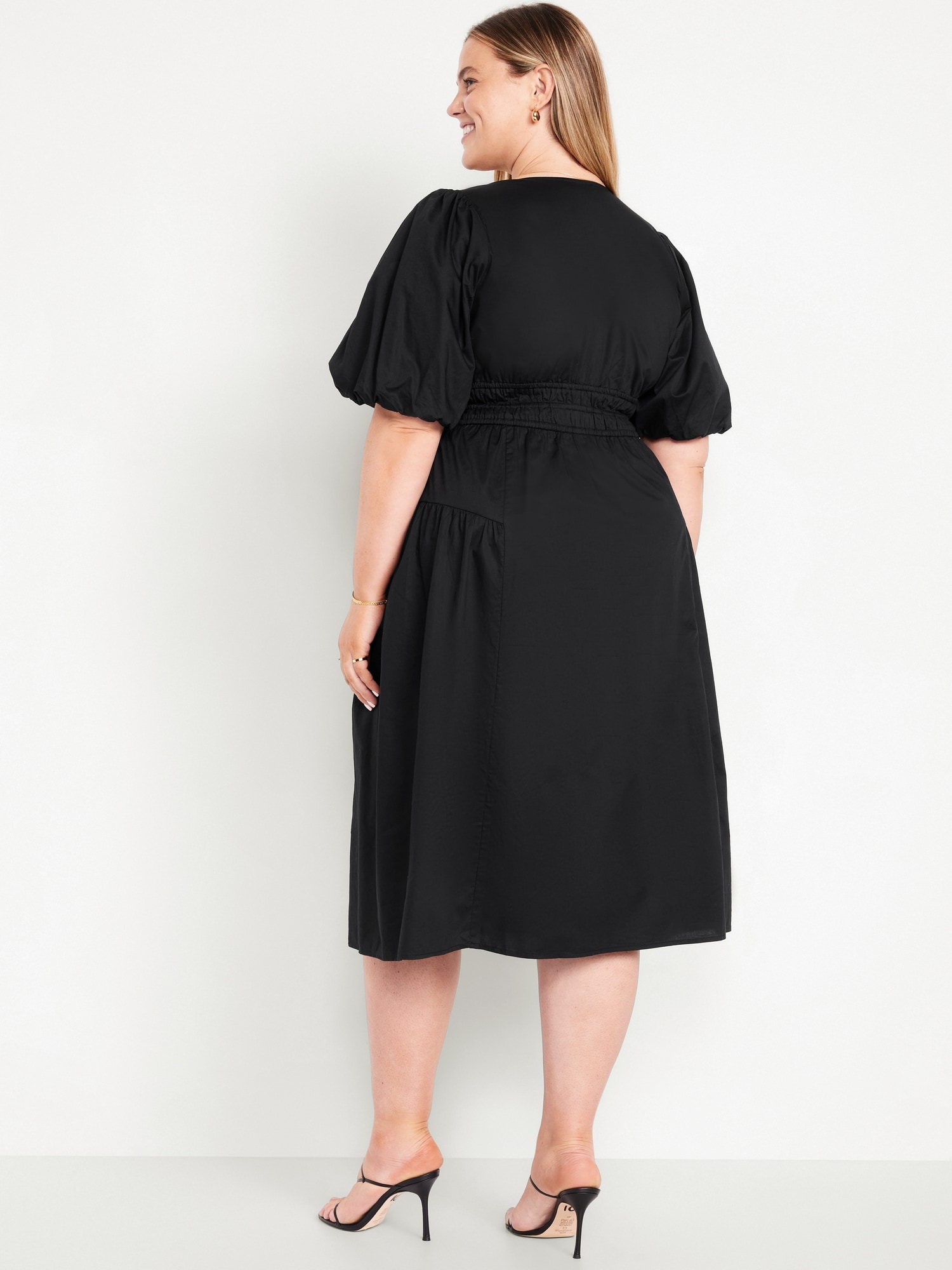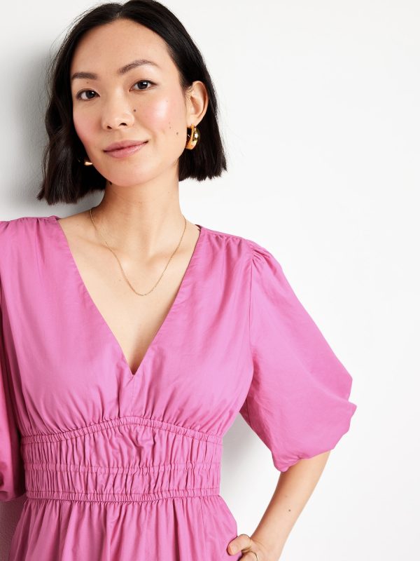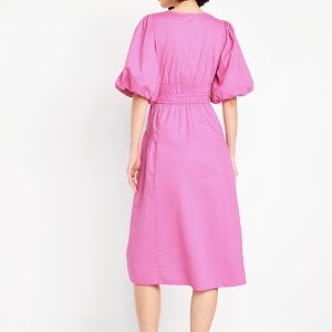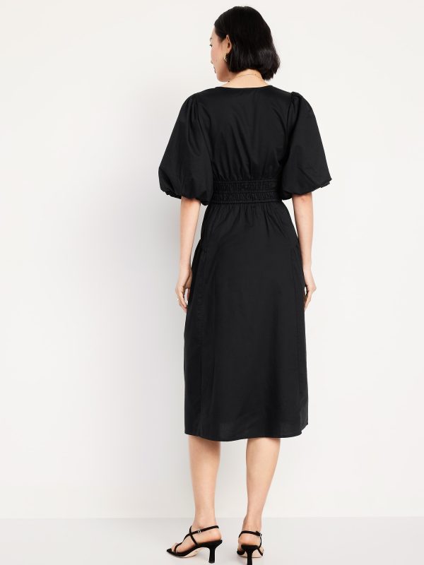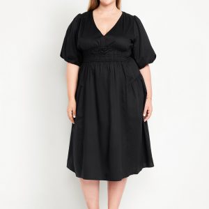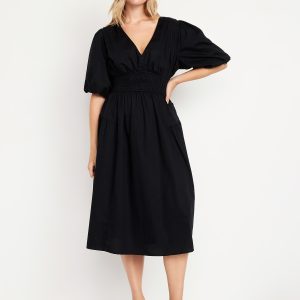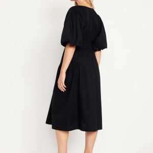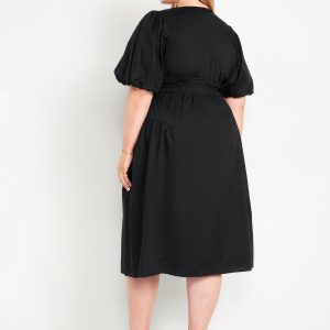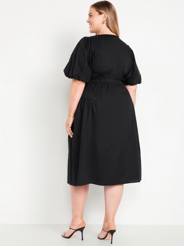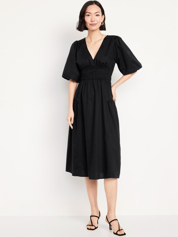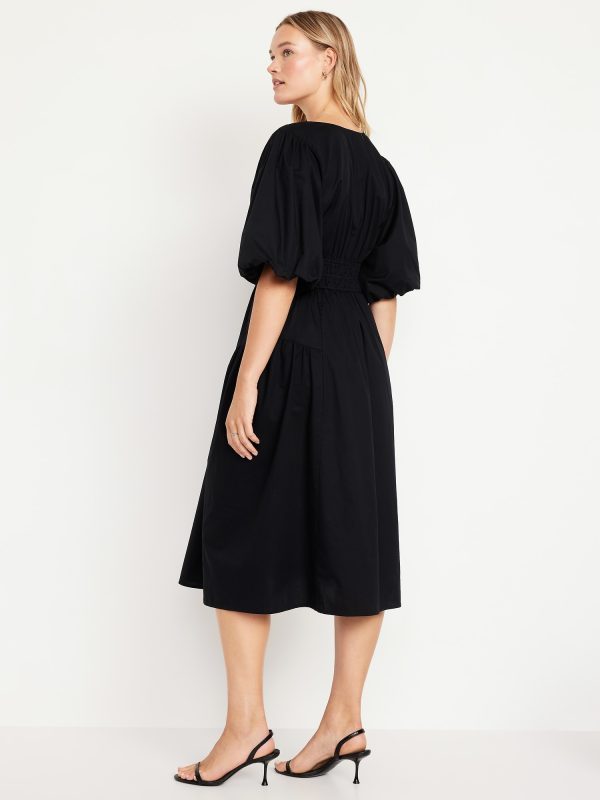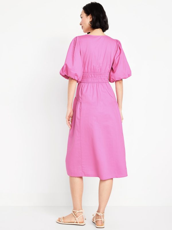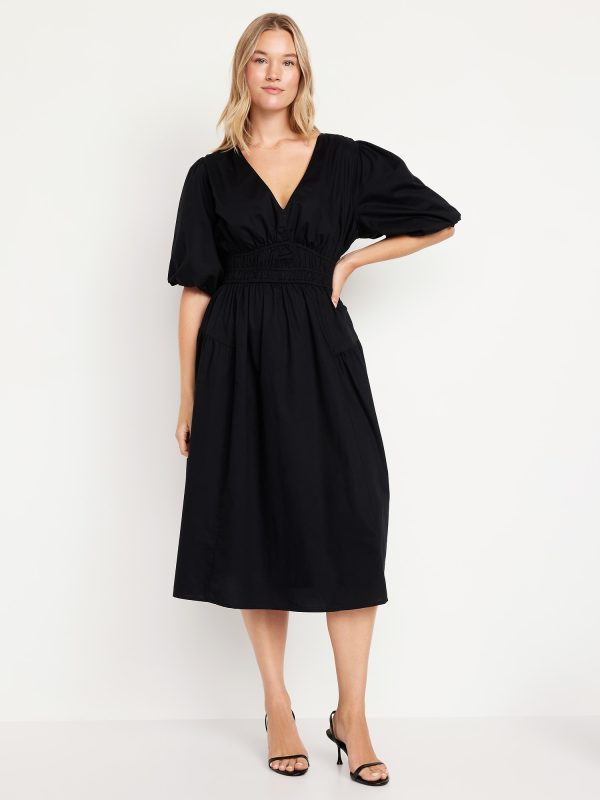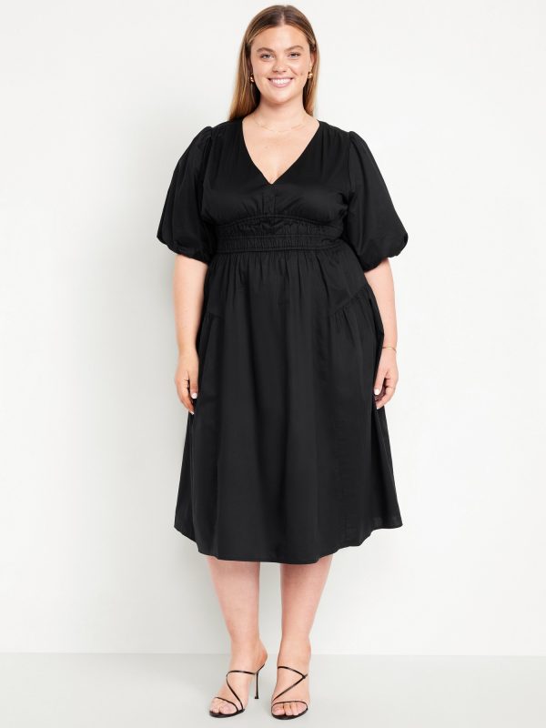 Waist-Defined Puff-Sleeve Midi Dress
