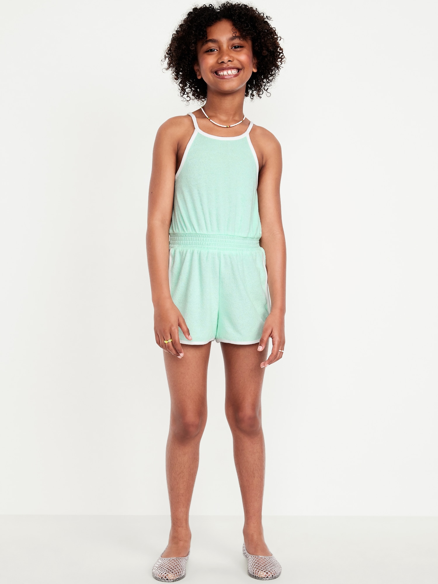 Waist-Defined Terry Romper for Girls: high neck, sleeveless, smocked defined waist, button-loop closure at nape, #766622