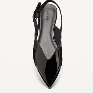 Wide Strap Slingback Flats: pointed toe, V-cut, buckle fastening at ankle, open heel, firm foot bed, textured outsole, #750760