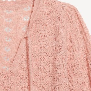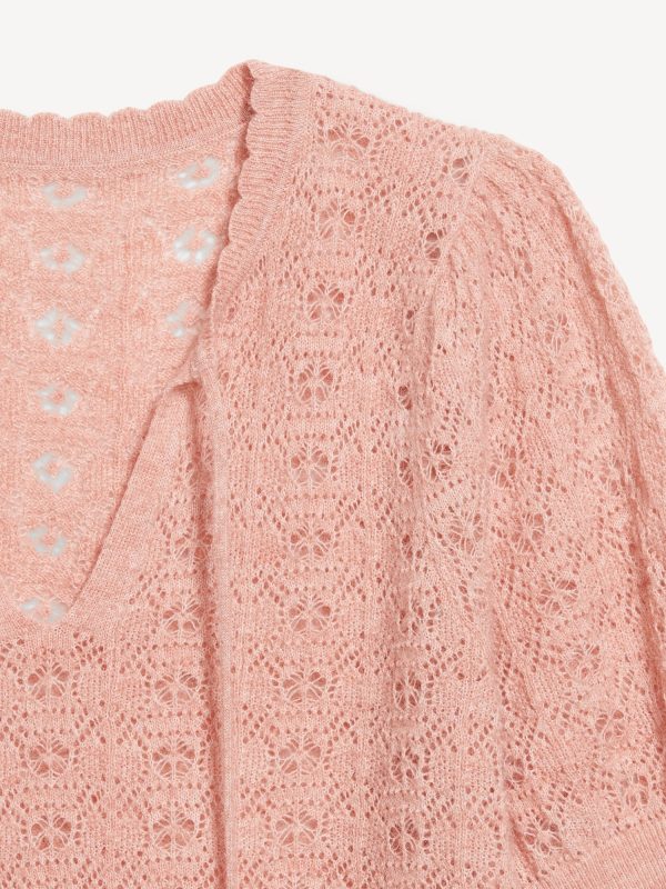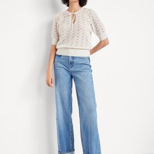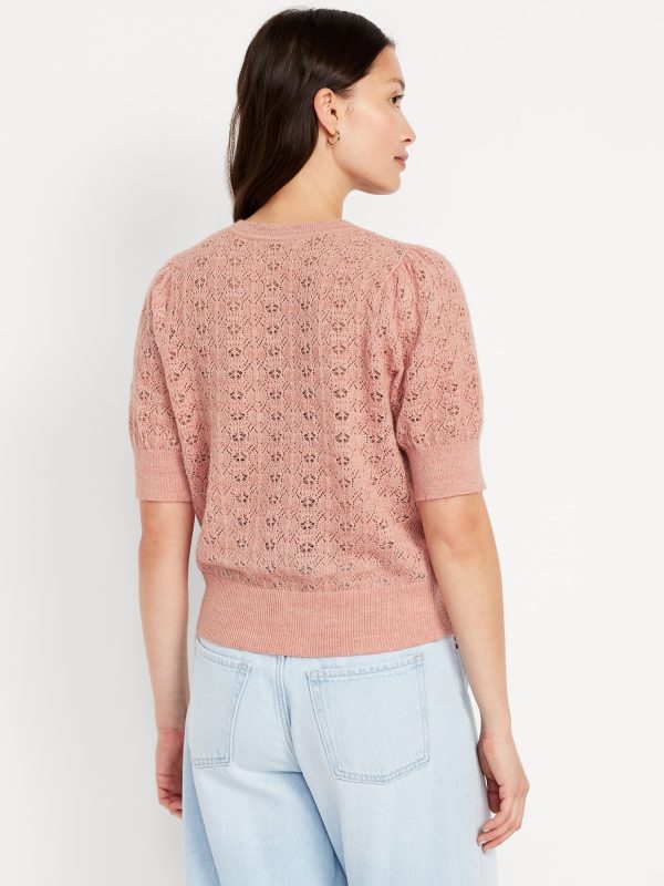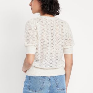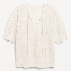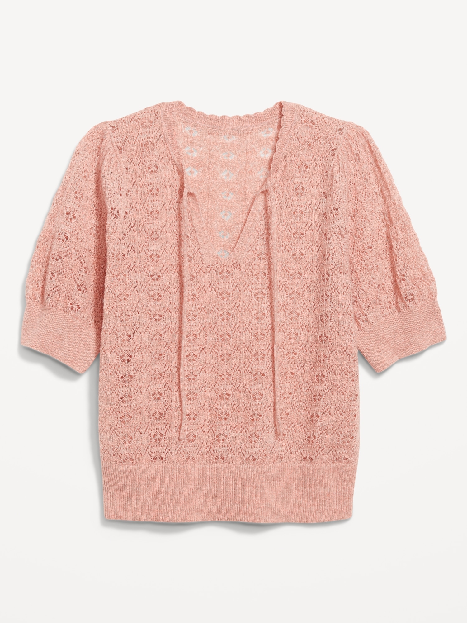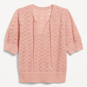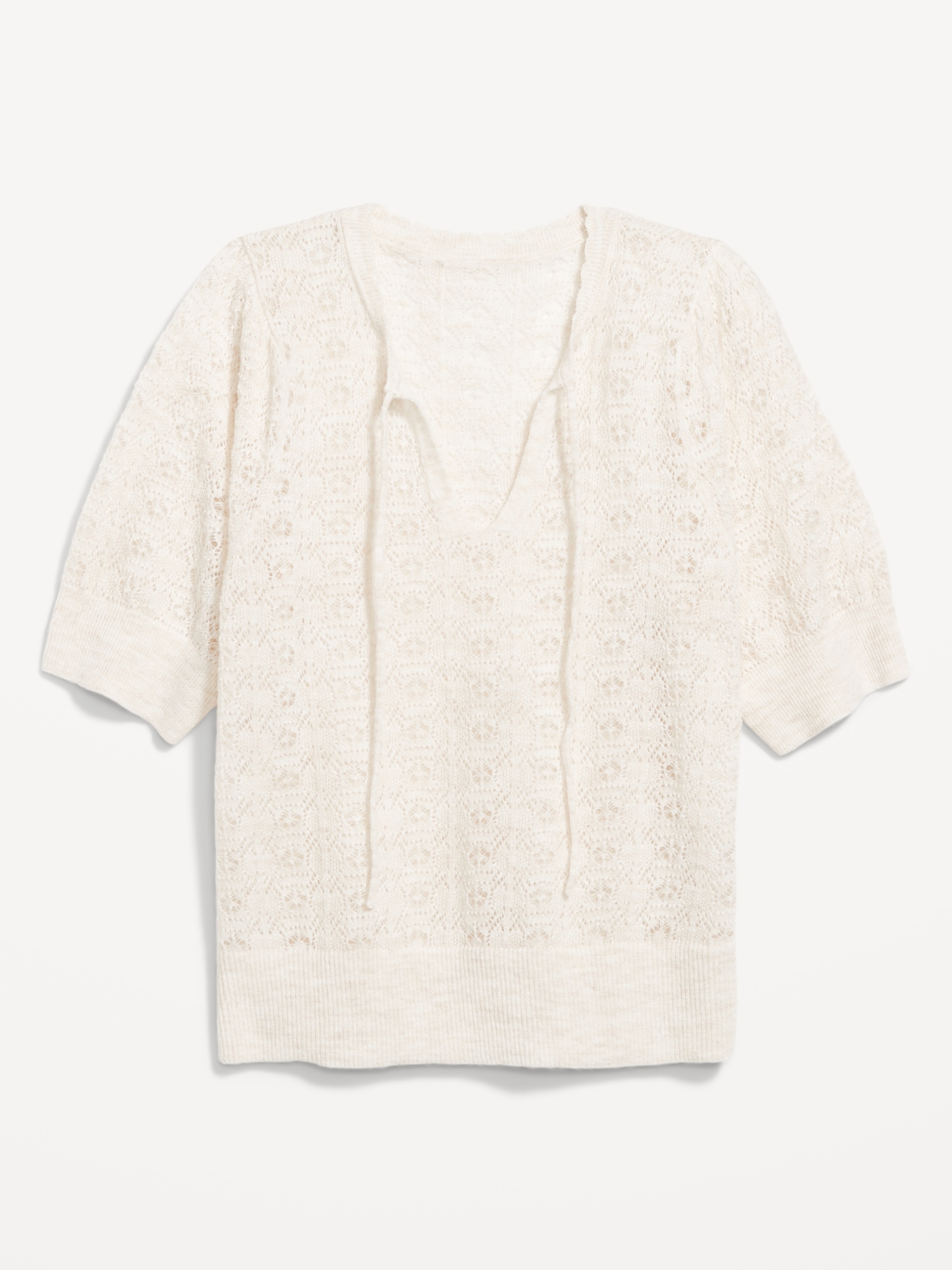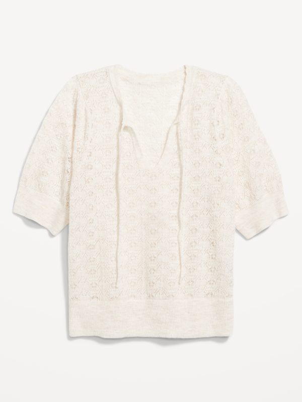 Wool-Blend Puff-Sleeve Tie-Neck Sweater: tie-front neck with keyhole cutout, elbow-length puff sleeves, pullover style, #785108